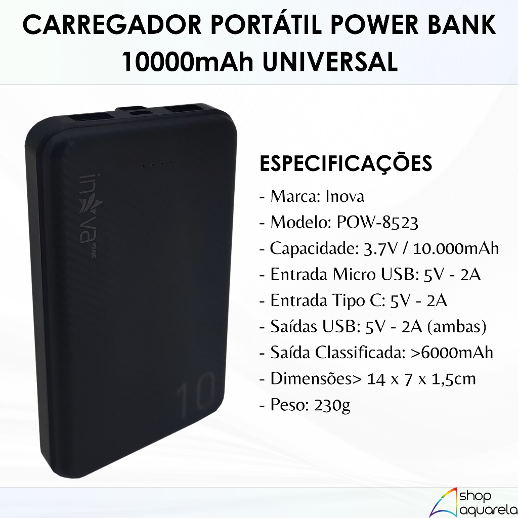 COMPATÍVEL COM: - Toda a linha iPhone (novos e antigos); - Toda a linha Android (novos e antigos); - Toda a linha Xiaomi (novos e antigos); - Toda a linha Samsung (novos e antigos); - MP3, MP4, GPS, caixas de som, microfones, câmeras, ring lights, smartwatchs, controles, fones de ouvido, portáteis, tablets, dentre outros. ESPECIFICAÇÕES TÉCNICAS - Marca: Inova - Modelo: POW-8523 - Peso: 230g - Capacidade: 3.7V / 10.000mAh / 44.4Wh - Entrada Micro USB: 5V - 2A - Entrada Tipo C: 5V - 2A - Saídas USB: 5V - 2A (ambas) - Saída Classificada: >6000mAh - Medidas: 14 x7x1,5cm. (CxLxA) - Peso: 249g CARACTERÍSTICAS - Universal, compatível com Smartphones, Smartwatches, Fones de Ouvido Bluetooth, Controles sem fio, Tablets, MP4, PSP/GPS, Câmeras, dentre outros equipamentos; - O design desse produto facilita o transporte e a manutenção. Cabe facilmente em bolsas e em bolsos; - Possui luzes indicativas de LED para mostrar o nível de carga armazenado no Power Bank; - Possui proteção múltipla contra descarga, sobrecarga e curto-circuito; - Produto Original Inova (Qualidade garantida). Compatível com todos os celulares. Saídas de energia pelas portas USB 1 e 2 para carregamento do seu celular ou aparelho. É necessário utilizar cabo com pelo menos uma ponta USB padrão. Não funciona com cabos com uma ponta Tipo C e outra ponta Lightning ou com as duas pontas Tipo C. Para carregamento do Power Bank Entradas tipo C e micro USB v8. Um Power Bank com DUAS saídas USB, acompanhado de um cabo Micro-USB V8 para carrega-lo. Você poderá carregar, simultaneamente, até dois aparelhos. Você poderá fazer suas viagens e se manter conectado SEMPRE. Carregue seu celular, seu smartwatch, caixa de som, GPS, tablet ou qualquer equipamento. Esse carregador é UNIVERSAL. •Obs: O cabo que acompanha o produto é apenas para o carregamento do próprio Power Bank, para carregar os celulares, deve-se utilizar o cabo adequado para cada modelo. CONTEÚDO DA EMBALAGEM - 2 Power Bank de 10.000mAh; Original Inova - 2 Cabos Micro USB para carregamento do próprio Power Bank;
