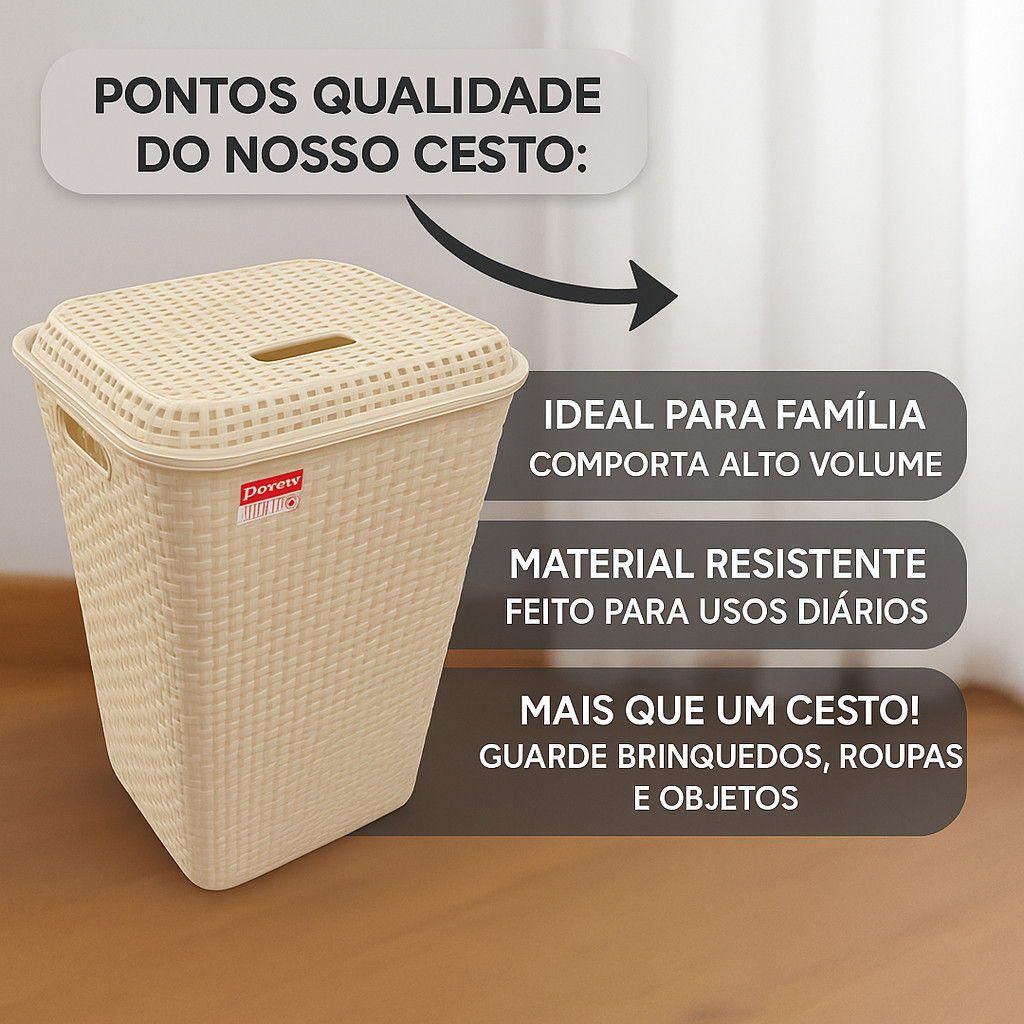 O kit com 2 cestos de roupa suja 72 litros estilo rattan é ideal para manter roupas organizadas com praticidade no dia a dia. Cada cesto possui grande capacidade, tampa funcional e estrutura em plástico resistente que garante durabilidade e fácil higienização. Perfeito para lavanderia, banheiro, quarto ou área de serviço, permitindo separar roupas por tipo ou cor com mais organização. CARACTERISTICAS DO PRODUTO Kit com 2 cestos organizadores de roupa suja Capacidade de 72 litros por unidade totalizando 144 litros Fabricado em plástico resistente e durável para uso diário Design estilo rattan moderno que combina com diversos ambientes Tampa com encaixe firme que auxilia no controle de odores Estrutura leve que facilita o transporte e manuseio Superfície lisa que facilita a limpeza e higienização DIMENSÕES DO PRODUTO Altura: 62cm Largura inferior: 35cm Largura superior: 45cm Comprimento inferior: 27cm Comprimento superior: 35cm O QUE ACOMPANHA 2 Cestos de roupa suja 72 litros com tampa