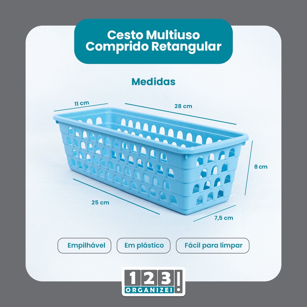 Cesto Multiuso Comprido Retangular Azul 123 Organizei Os Cestos Multiuso 123Organizei, são muito charmosos e discretos. Podem ser usados em armários, gavetas, guarda roupas e até mesmo em banheiro. MEDIDAS Altura: 8,00cm Largura: 11,00cm Comprimento: 28,00cm 123Organizei