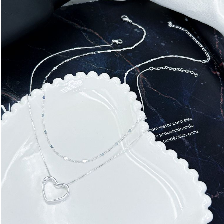 KIT 2 Choker Colar com detalhe de coração + Colar Coração Vazado Feminino em banhado a Prata 925 - tipo Tyfanny