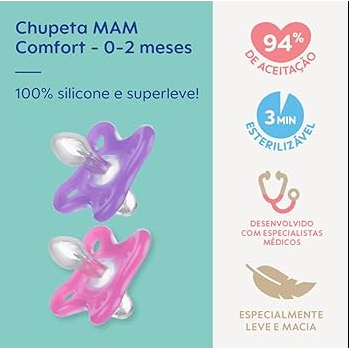 | Kit 2 Chupetas Confort 100% Silicone 0-2 Meses Rosa e Roxa - MAM este produto | R$ 84,00 | — | 5.0/5 | 3 |