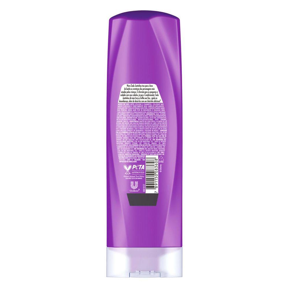 O Kit contém 2 Condicionadores Seda Infantil Frozen Juntinhos Brilho Encantado 300ml cada. Condicionador Frozen Brilho Encantado. Força e briho para todos os tipos de cabelo. O Condicionador Seda Juntinhos limpa e dá mais força e brilho aos fios, deixando-os mais fáceis de pentear e com um cheirinho delicioso! Seda não testa em animais. Com o uso do shampoo e condicionador Seda Juntinhos Frozen em comparação com shampoo sem agentes condicionantes inclusão de pelo menos 39 de plástico reciclado. Nossa garrafa é feita com plástico reciclado e é 100 reciclável Novo Seda Juntinhos traz para a hora do banho as aventuras das personagens mais amadas pelas crianças. É diversão para os pequenos e cuidado com seus cabelos, já que o Condicionador Seda Juntinhos dá mais força e brilho aos fios, ajuda no desembaraço, além de deixar-los com um cheirinho delicioso! Como usar Após utilizar o shampoo, coloque nas mãos e aplique-o diretamente nos cabelos molhados. Espalhe por toda extensão dos fios, concentrando mais nas pontas. Deixe agir por 30 segundos e enxágue bem. Para um resultado ainda melhor, aplique o creme para pentear e desembaraçar Seda Juntinhos no cabelo úmido ou seco, espalhe bem, penteie e não enxágu