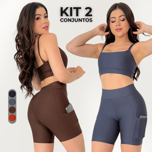 Kit 2 Conjunto Fitness Feminino Short Com Bolso Top Suplex Academia Treino Corrida