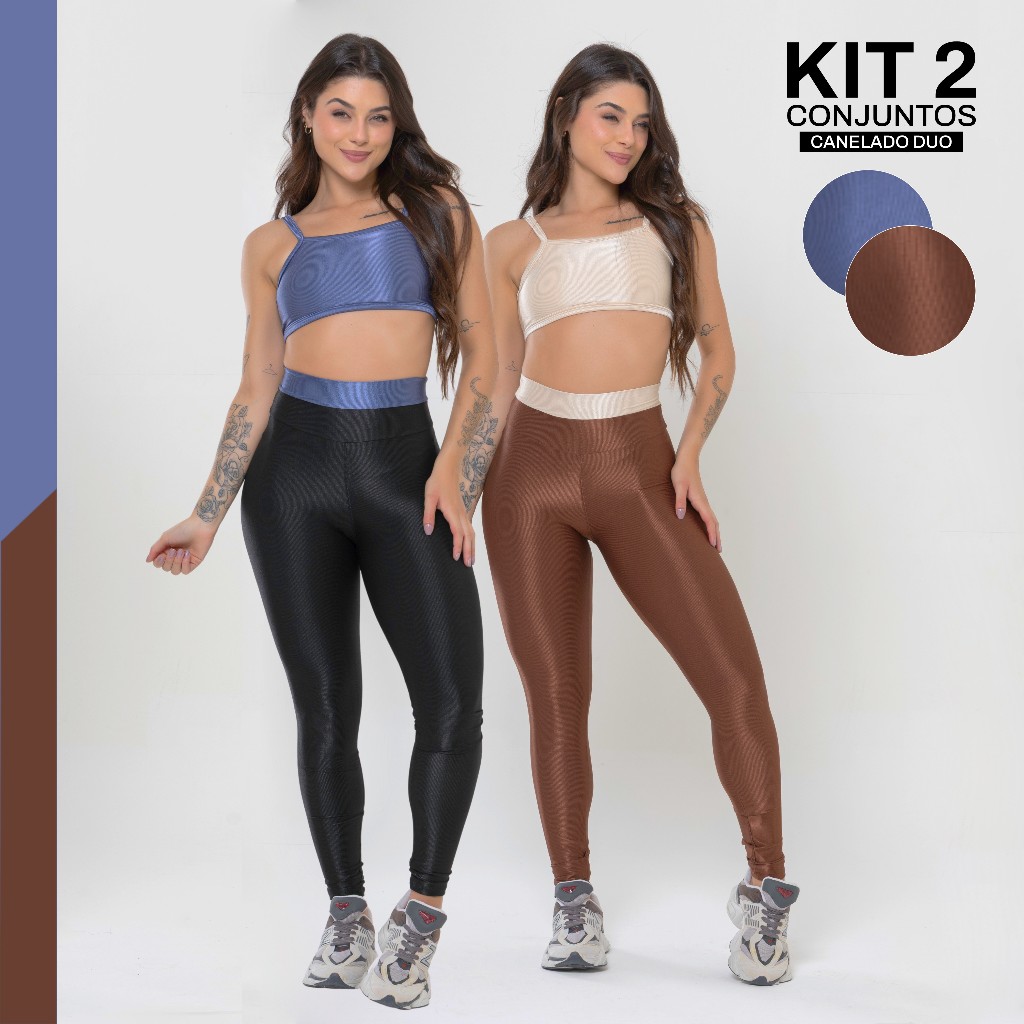 Kit 2 Conjuntos Fitness De Academia Duo Canelado Brilhoso Legging Alta Compressão