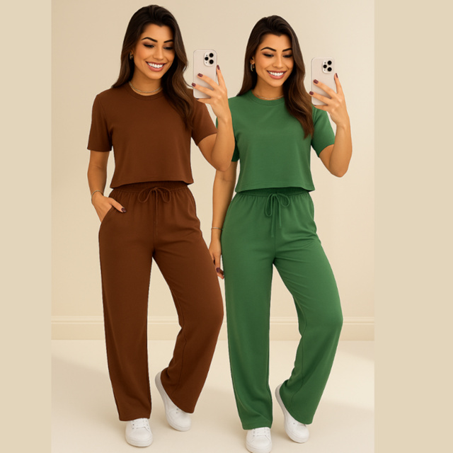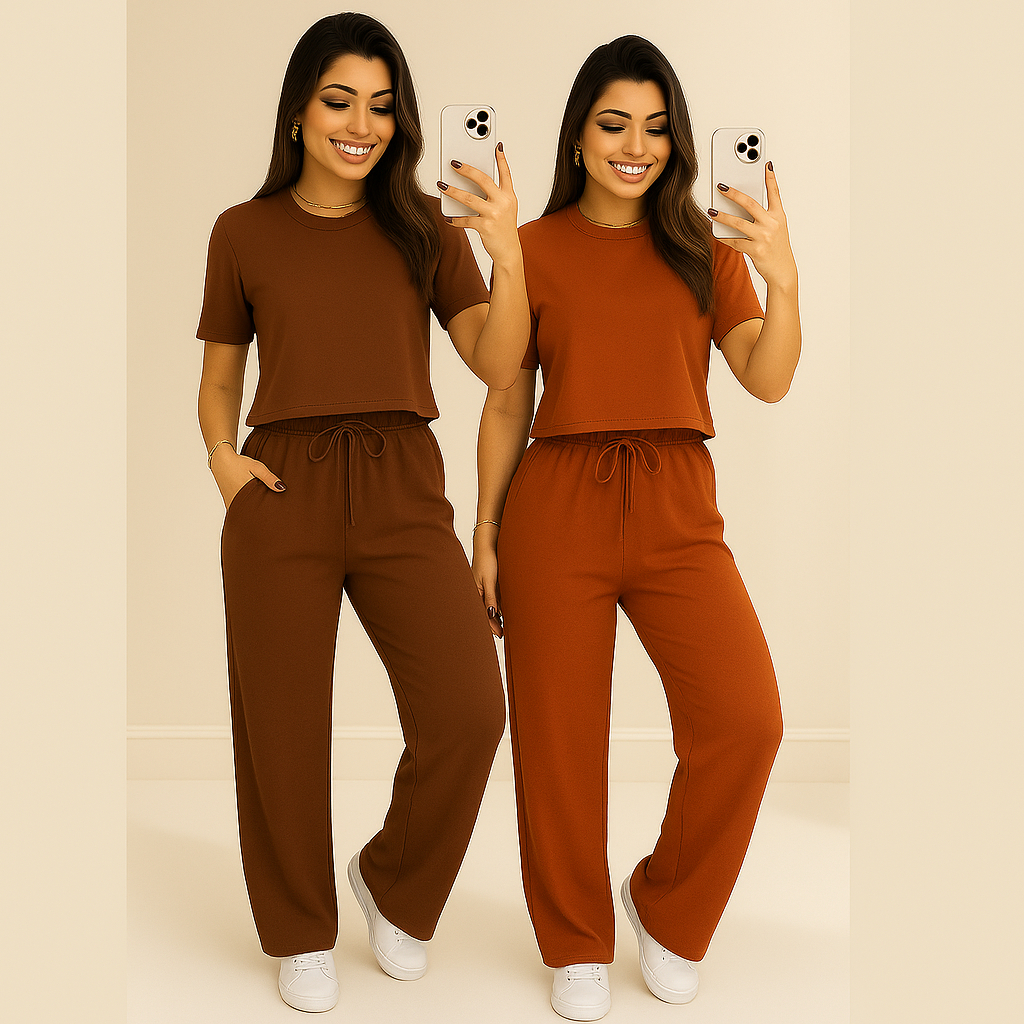conjunto feminino em moletinho é a combinação perfeita entre conforto e estilo. Composto por uma blusa de manga curta com modelagem reta e comprimento levemente encurtado, proporciona um visual moderno e despojado. A calça pantalona possui caimento solto, cintura alta com elástico e cordão ajustável, além de bolsos laterais funcionais, oferecendo praticidade e elegância ao mesmo tempo. O tecido em moletinho garante um toque macio e aconchegante, ideal para uso casual ou para compor looks sofisticados com conforto. A cor verde musgo traz sofisticação e versatilidade, combinando facilmente com diferentes acessórios e calçados. Perfeito para quem busca um visual alinhado, moderno e confortável para o dia a dia, viagens ou momentos de lazer.