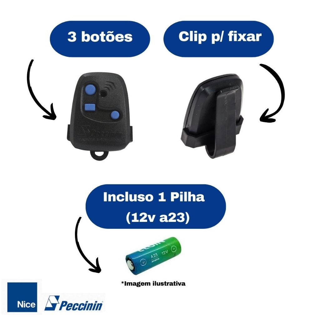 Kit 2 Controles Remotos 3C Peccinin Nice para Portões de Residências/Casas ⚠ INFORMAÇÃO IMPORTANTE ❗❗: - ✅ Funciona somente para portões de CASAS ✅ - ✅ Funciona somente para motor marca NICE ✅ - ✅ Peccinin e Nice é a mesma marca✅ - ❌Não funciona para Condominíos/Apartamentos ❌ - ❌Não funciona para outras marcas de motores ( somente NICE ) ❌ - Escolha a cor na variação do anúncio Qualquer dúvida, chame a gente no chat antes de comprar! 📦 INCLUSO NO PRODUTO: - 02 unidades - Clip para fixar - 01 pilha - Nota fiscal 🚚 ENVIOS E PRAZOS: - Enviado em até 24hrs após a compra - Nota fiscal - Embalagem segura - Garantia do fabricante 📝 INFORMAÇÕES TÉCNICAS DO PRODUTO: - O controle remoto para portões de casas, residências 3C é um transmissor de sinal codificado que impede a clonagem, garantindo segurança e maior alcance sem interferências. - Rolling CodeFrequência de 433,92 MHz , Ressonador Saw3 botões de comando . Design compacto e ergonômico, compatível com toda a linha de automatizadores das marcas Peccinin e Nice com menos de 8 anos de fabricação. 📝COMO CONFIGURAR? *** - A configuração é simples e o manual de instruções está localizado na parte interna da embalagem. ❓ FAQ - PERGUNTAS FREQUENTES❓ : 1 - Como configurar o controle no automatizador? A configuração é simples e pode ser realizada seguindo as instruções do manual técnico. Consulte o site do fabricante para um guia detalhado. 2. Esse controle é compatível com outros modelos de automatizadores? Ele é compatível apenas com automatizadores Peccinin e Nice fabricados nos últimos 8 anos. 3. O controle acompanha pilhas? Sim, o produto já vem com pilhas inclusas e prontas para uso. 4. É necessário um profissional para instalar o controle? A configuração é simples, mas recomendamos que seja realizada por um profissional qualificado para garantir o funcionamento correto. 5. O produto é original? Sim, todos os produtos são 100% originais, acompanham nota fiscal e possuem garantia do fabricante. Informações Adicionais Produto à pronta entrega, todos os produtos possuem nota fiscal , Garantia do fabricante inclusa. 🤝 Em caso de dúvidas, entre em contato com nossa equipe pelo campo de perguntas! Estamos a disposição para ajudar! 🤝