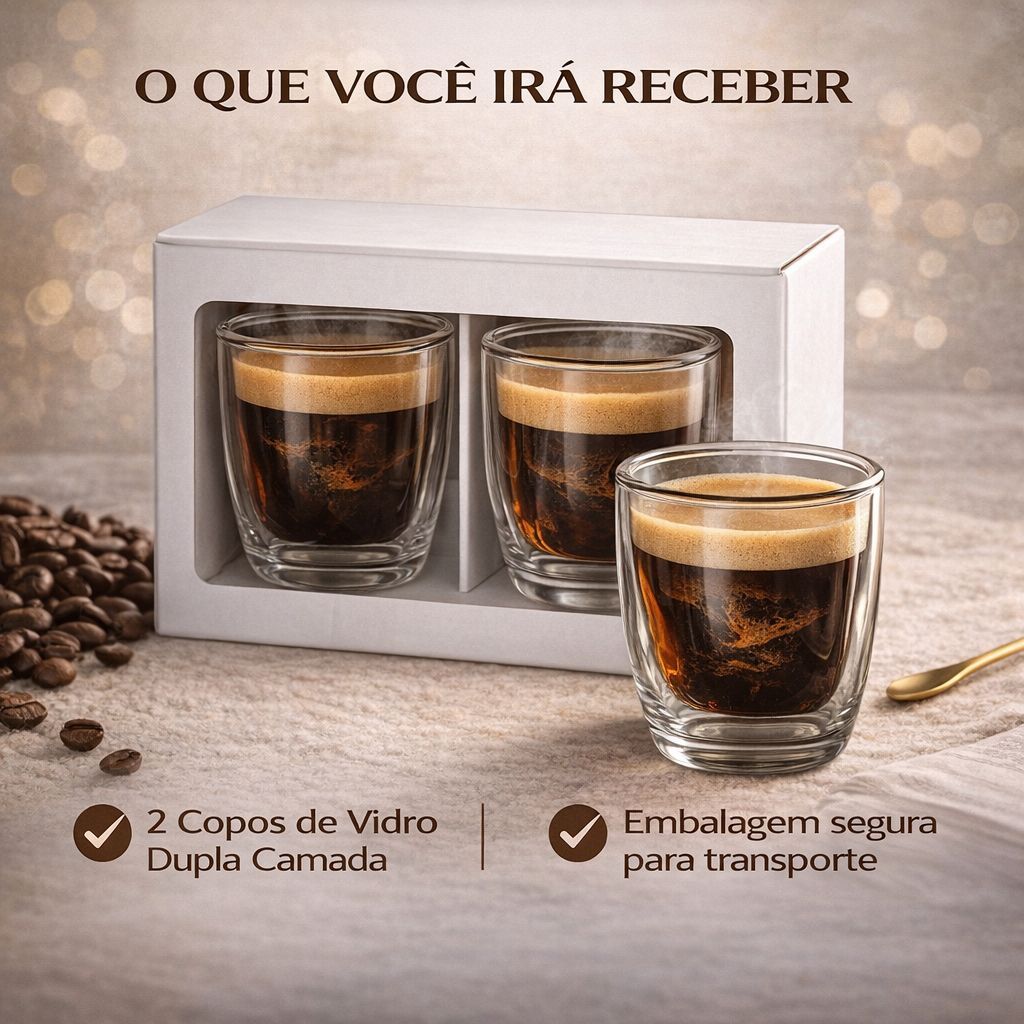 Transforme seu café em um momento especial com o conjunto de copos de vidro com dupla camada. Além de manter a temperatura da bebida por mais tempo, o design sofisticado cria um efeito visual incrível que valoriza qualquer ambiente. Principais Benefícios: ✔️ Dupla camada térmica ✔️ Não queima a mão ✔️ Mantém o café quente ✔️ Design sofisticado ✔️ Kit com 2 unidades 🛍️ DESCRIÇÃO do Produto Transforme seu café comum em uma experiência sofisticada com o exclusivo Caffè Eleganza Duo.Se você ainda toma café em copos comuns, está perdendo uma das melhores partes do seu dia. A experiência não é só sobre a bebida — é sobre como você se sente ao consumir. E a verdade é que pequenos detalhes fazem toda a diferença na sua rotina. Com o design de dupla camada, seu café permanece quente por mais tempo enquanto suas mãos continuam protegidas. Nada de desconforto ou pressa para beber. Aqui, você aproveita cada gole com calma, estilo e muito mais prazer. O Caffè Eleganza Duo transforma um hábito simples em um momento de destaque no seu dia. Além de funcional, o visual impressiona. O efeito flutuante do café cria uma estética moderna e sofisticada que chama atenção imediatamente. É o tipo de produto que faz qualquer ambiente parecer mais elegante, seja na sua cozinha, no trabalho ou ao receber visitas. Você também leva a sensação de estar fazendo um ótimo negócio: um item com aparência premium, durável e extremamente útil, por um valor acessível. Enquanto muitos continuam no básico, você escolhe algo que realmente se destaca. E não para por aí… esse conjunto também é perfeito para presentear. É aquele tipo de escolha que agrada qualquer pessoa, sem erro, útil, bonito e com um toque de exclusividade que surpreende. 📏 Capacidade: 90ml cada 📐 Dimensões: Altura 8cm 🧪 Material: Vidro de alta qualidade com dupla camada efeito térmico 🚨 ESTOQUE LIMITADO – ALTA PROCURA Esse produto está entre os mais desejados do momento e pode esgotar a qualquer momento. Garanta agora o seu antes que o preço suba no próximo lote.