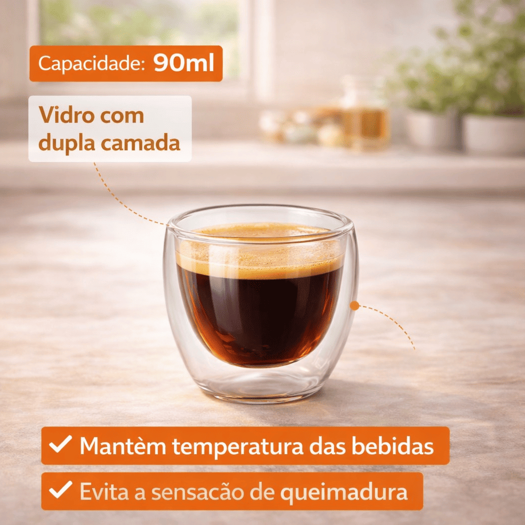 📌 ESPECIFICAÇÕES 📏 Dimensões: 7 cm altura x 6 cm diâmetro 🥛 Capacidade: 90 ml cada 🧱 Composição: Vidro 🎨 Cor: Transparente ⚖ Peso do conjunto: 151 g ☕ CONJUNTO 2 COPOS PARA CAFÉ VIDRO DUPLA CAMADA 90ML Elegância, praticidade e sofisticação para apreciar um bom espresso ✨ Com capacidade ideal de 90 ml, é perfeito para café curto, ristretto, degustações e pequenas porções de bebidas quentes. O grande diferencial está no vidro com dupla camada, que cria efeito térmico mantendo a temperatura da bebida por mais tempo e reduzindo a transferência de calor para as mãos. 🔥 CONFORTO E TECNOLOGIA ✔ Isolamento térmico eficiente ✔ Não esquenta por fora ✔ Reduz condensação externa ✔ Mais conforto ao segurar O design moderno e totalmente transparente valoriza a crema do café, realçando cores e camadas para uma experiência mais sofisticada. 🏡 IDEAL PARA ☕ Uso doméstico 🏢 Escritórios ☕ Cafeterias 🎁 Receber visitas com mais requinte Leve, resistente e com acabamento refinado, traz um toque contemporâneo à mesa posta ou ao cantinho do café. ❓ PERGUNTAS FREQUENTES 🔸 Mantém o café quente por mais tempo? Sim. A dupla camada ajuda a conservar a temperatura. 🔸 Esquenta por fora? Não. O isolamento térmico reduz a transferência de calor. 🔸 Pode usar com bebida fria? Sim. Também ajuda a reduzir condensação externa. 🔸 É resistente para uso diário? Sim. Fabricado em vidro resistente e leve. 📦 CONTÉM 01 Conjunto 2 Copos Para Café de Vidro com Dupla Camada 90ml