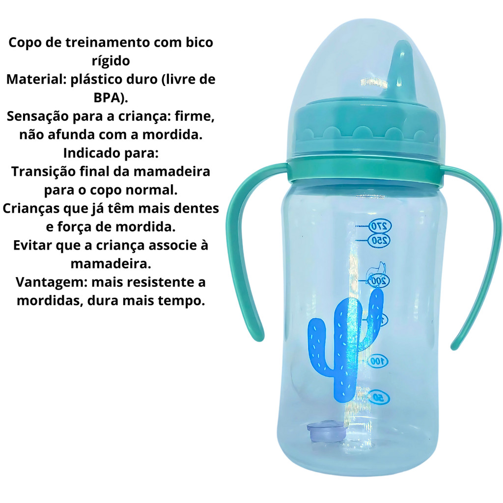 Kit Copos de Treinamento Infantil 270ml – Petita com Bico de Silicone Macio e Bico Rígido O kit copos de treinamento Petita é a escolha ideal para a fase de transição da mamadeira para o copo. Desenvolvido para oferecer segurança, conforto e praticidade, ele acompanha todas as etapas do desenvolvimento do bebê, garantindo autonomia com produtos de alta qualidade. Este kit de copos de transição vem com dois modelos diferentes, perfeitos para cada fase do aprendizado: Copo de treinamento com bico de silicone macio: delicado e confortável, lembra a sensação da mamadeira e protege as gengivas sensíveis. Copo de treinamento com bico rígido: resistente e durável, ideal para a etapa final da transição, ajudando a criança a se adaptar ao copo comum. Benefícios do Kit Copos de Treinamento Petita Copo infantil completo: acompanha copinho de treino com bico macio e copo de aprendizado com bico rígido. Sistema copo antiderrame com válvula antivazamento, evitando sujeira e desperdício. Produzido em plástico seguro e material de qualidade, totalmente livre de BPA. Copo com alça e alças ergonômicas, fáceis de segurar por mãos pequenas. Estrutura leve, resistente e fácil de higienizar. Capacidade ideal: 270ml cada copo. Funciona como copo para bebê e copo para aprender a beber em todas as fases. Especificações do Produto Kit com 2 copos de 270ml (1 bico de silicone macio + 1 bico rígido) Materiais: plástico seguro e silicone Idade recomendada: acima de 6 meses Válvula antivazamento Estrutura leve e prática para o dia a dia Por que escolher o Kit Copos de Treinamento Infantil Petita? Com esse kit, seu bebê terá o copo de transição certo para cada momento. O modelo com bico macio é perfeito para as primeiras tentativas, enquanto o copo rígido ajuda na adaptação ao copo comum. Garanta já o kit copos de treinamento infantil Petita 270ml e proporcione ao seu filho uma transição tranquila, saudável e segura, com muito mais praticidade para o dia a dia.