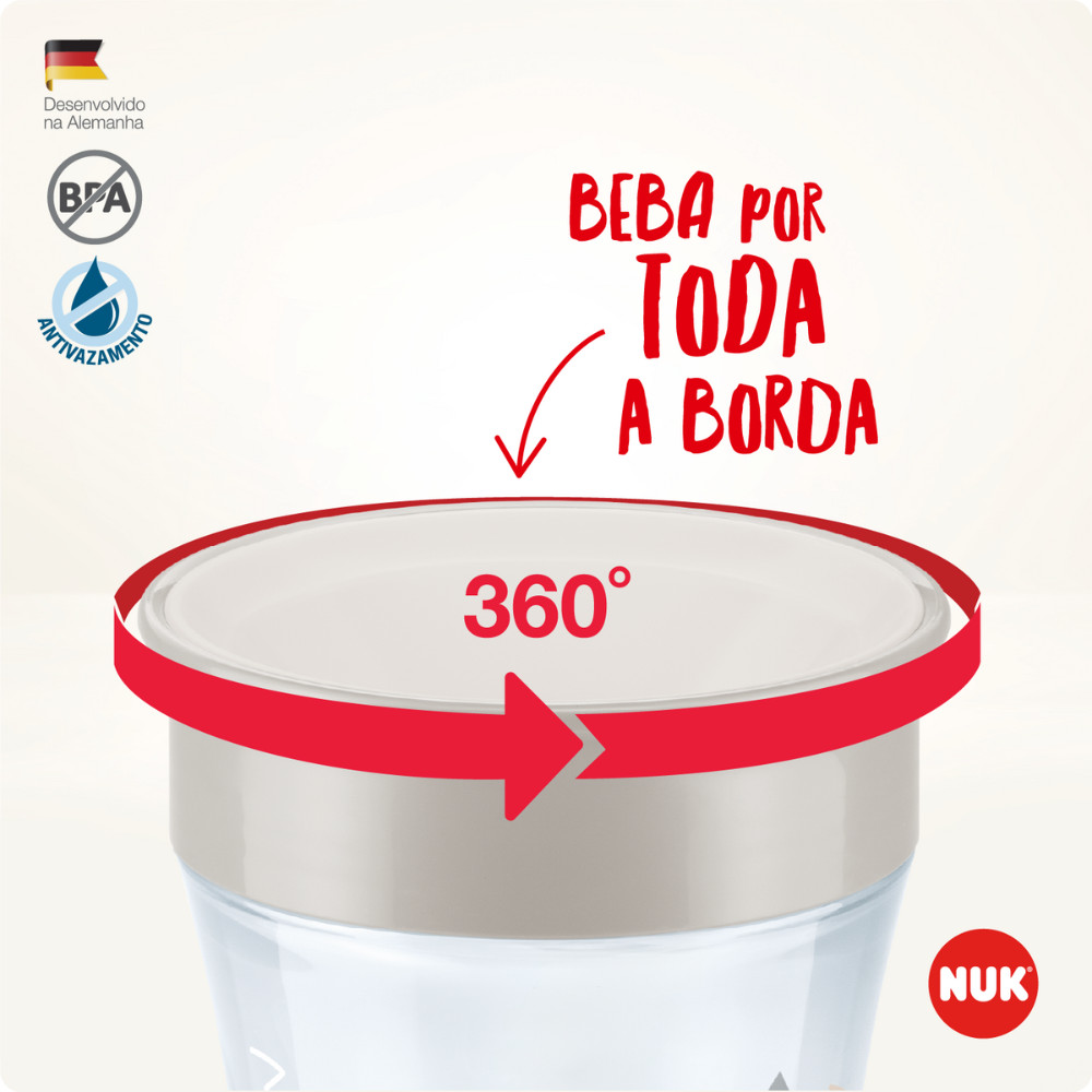 Kit 2 Copos Antivazamento e Treinamento Infantil 360º Magic Cup Evolution 230ml Cada Neutro Nuk O Kit de Copos Magic Cup 360° da NUK foi desenvolvido para tornar a fase de transição do bebê para o uso do copo convencional mais prática, segura e divertida. Com design moderno e funcional, ele estimula a autonomia da criança enquanto acompanha seu desenvolvimento com conforto e eficiência. Pensado especialmente para ensinar o bebê a beber sozinho(a), o Magic Cup 360° auxilia em um dos marcos mais importantes da primeira infância: o uso independente do copo. Seu formato ergonômico facilita o manuseio pelas pequenas mãos, contribuindo para o desenvolvimento das habilidades motoras e oferecendo uma experiência semelhante à de um copo tradicional, porém com muito mais segurança e menos bagunça. O grande diferencial dos Copos Magic Cup está em seu sistema 360°, que permite beber de qualquer lado da borda, liberando o líquido apenas quando os lábios da criança entram em contato. Além disso, conta com tampa protetora e borda com estrutura antivazamento altamente eficiente, evitando derramamentos mesmo quando o copo é virado ou agitado — ideal para uso em casa, passeios ou para levar na mochila. Indicado para crianças a partir de 8 meses, o Magic Cup 360° é a escolha ideal para unir funcionalidade, aprendizado e praticidade no dia a dia das famílias. Principais Características: - Idade recomendada: A partir de 8 meses - Capacidade: 230ml - Modelo: Magic Cup 360° Evolution - Totalmente Livre de BPA - Borda 360º Antivazamentos - Tampa Protetora Higiênica - Frasco Ergonômico Antivazamento - Estimula a autonomia e o desenvolvimento das habilidades motoras. - Material Leve e Resistente - Fácil Higienização Especificações Técnicas - Conteúdo da Embalagem: Kit 2 Copos Magic Cup 360° Evolution - NUK - Composição/Material: Polipropileno - Garantia: 30 dias (contra defeito de fabricação pelo fabricante) - Referência do Fabricante: PA7659-1N - EAN: 7896098815250 - Marca: NUK Imagens meramente ilustrativas, as cores e estampas podem variar de acordo com o lote do fabricante.