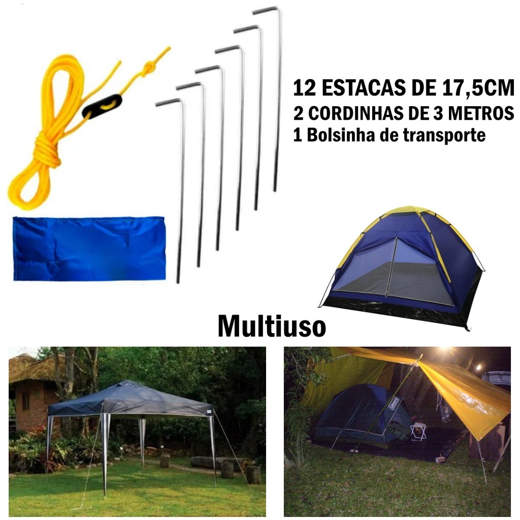 Kit 12 Estacas de Fixação de Gazebos, Barracas, Tendas, Guarda-Sol, entre outros + 2 Cordinhas de 3 metros. Chega de apuros quando entra aquele vento na sua barraca. Especificações:- 12 Estacas.- Comprimento: 17,5 cm. - Material das estacas: Aço galvanizado. - Espessura (Diâmetro): 4 mm. - 2 Cordinhas de 3 metros. - Ótimo para fixação em areia, terra ou gramado. - Garanta a estabilidade dos seus equipamentos. - Este kit é adequado para gazebos, barracas, gaurda-sol, tendas, mangueiras de irrigação, churrasqueiras portáteis, carrinhos de transporte, utensílios que ficam ao ar livre, cadeiras, mesas de plástico. Perguntas frequentes:1-Tem a pronta entrega? Sim, todos nossos produtos são a pronta entrega.2-Emite nota fiscal? Sim.3-Tem garantia? Tem garantia de 3 meses (Contra defeitos de fabricação) após receber o produto, sendo que em caso de troca os fretes são por conta do comprador. Mas, no prazo de 7 dias após receber o produto pode devolver sem custo algum e receber o estorno da compra.4- Quanto tempo demora para chegar em minha casa? Depende da sua localidade, mas o prazo pode verificar logo abaixo do preço.5- Qual o valor do frete? Pode verificar logo abaixo do preço.6- Eu gostaria de duas cores diferentes ou de dois produtos diferentes, como fazer? Selecione o primeiro que deseja e coloque no carrinho, depois coloque a outro que deseja. Clique no carrinho e basta efetuar a compra.