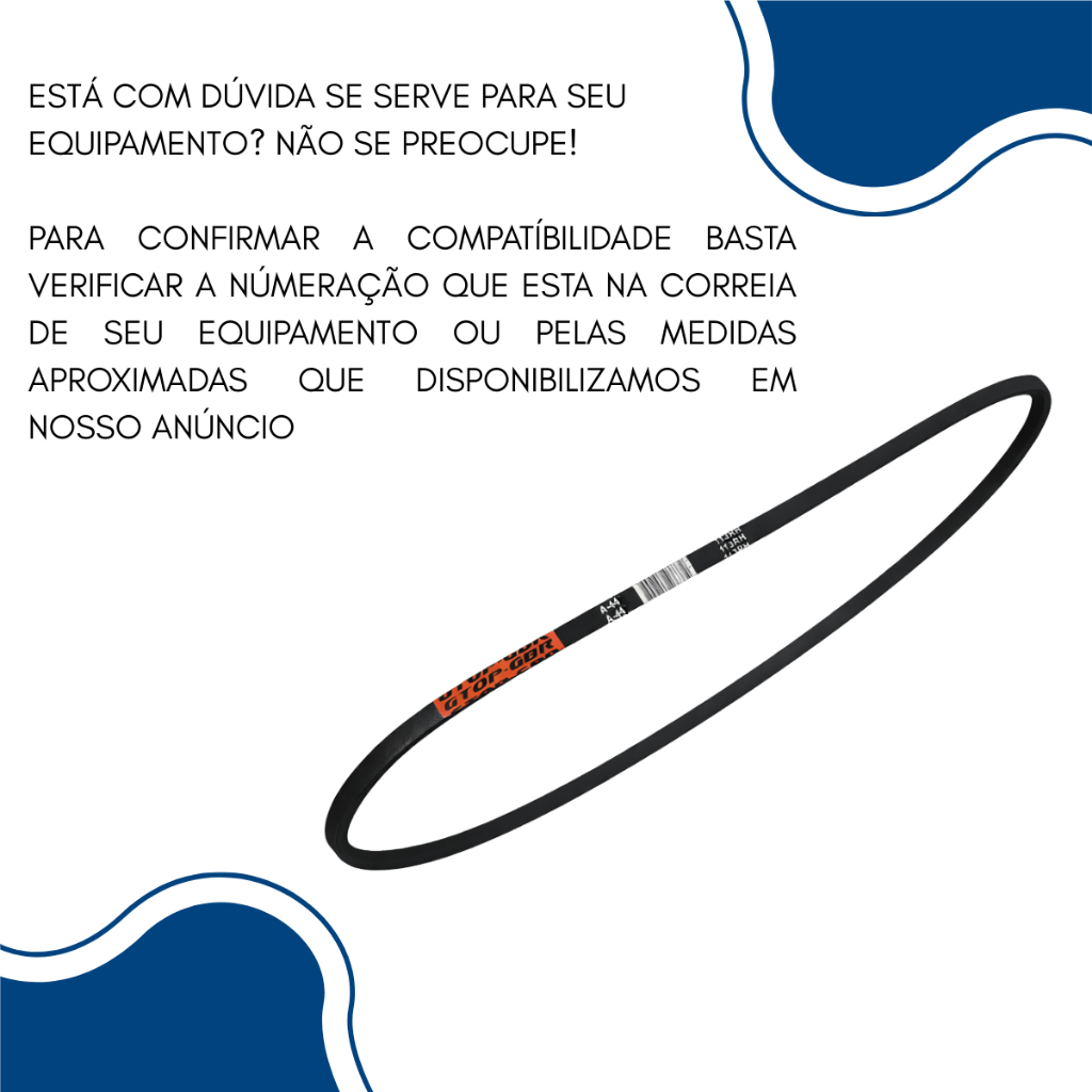 Correia A-44 Para utilização em Betoneira e Outros Equipamentos ( NESTE ANÚNCIO VOCÊ ESTARÁ ADQUIRINDO DUAS CORREIAS ) ( COMPATÍVEL PARA BETONEIRAS DE 400L E EM OUTROS EQUIPAMENTOS ) ( CASO SURGIR ALGUMA DÚVIDA NÃO HESITE EM NOS CONTATAR, ESTAREMOS A DISPOSIÇÃO ) === VERIFICAR A COMPATIBILIDADE ANTES DE EFETUAR A COMPRA === === O SEU PEDIDO SERÁ BEM EMBALADO === === COM NOTA FISCAL ELETRÔNICA === COMPATÍVEL: MOTORES ESTACIONÁRIOS COMPRESSORES BETONEIRAS MÁQUINAS AGRÍCOLAS EQUIPAMENTOS INDUSTRIAIS BOMBAS MÁQUINAS EM GERAL DETALHES DO PRODUTO: Marca: GTOP - GBR Modelo: Correia em V A - 44 Quantidade: 01 Kit INFORMAÇÕES TÉCNICAS: Modelo: Perfil A-44 Material: Borracha com reforço em poliéster Largura Superior: 13 mm Altura: 8 mm Resistência: Óleos e calor moderado Comprimento Interno: 1097,28 mm Comprimento Externo: 1153,16 mm Aplicação: Transmissão de potência *DÚVIDAS Fique à vontade para tirar sua dúvida no campo de perguntas, nós da Lcte responderemos rapidamente e não fique com receio, será um prazer tirarmos suas dúvidas. - SÓ TRABALHAMOS COM PRODUTOS A PRONTA ENTREGA - GARANTA JÁ O SEU PEDIDO - LCTE