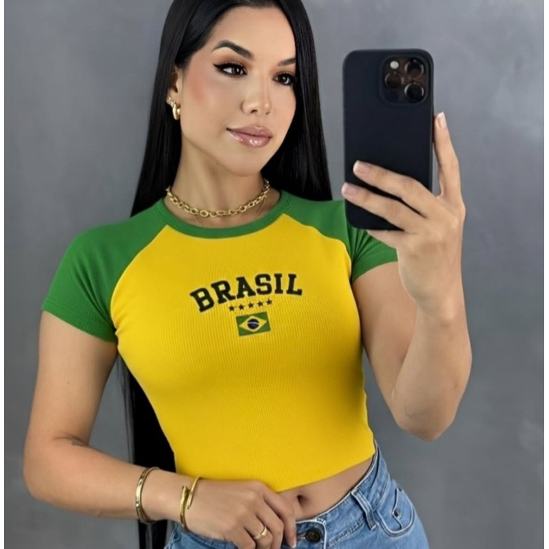 Kit 2 Cropped do Brasil Feminino Ribana Bicolor Manga Curta Babylook Copa Gringa Estilosa