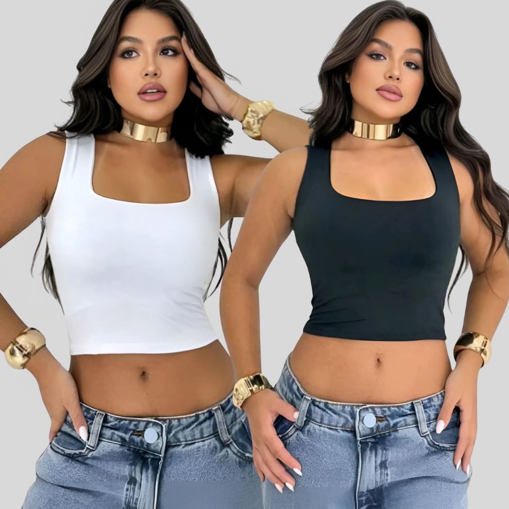 Kit 2 Cropped Feminino Decote Quadrado Alça Grossa – Estilo e Conforto em Dobro