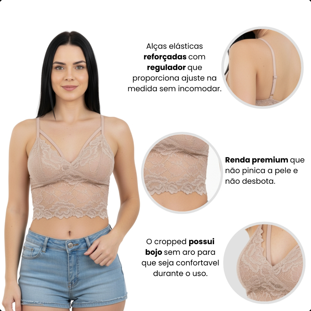 Kit 2 Cropped Top de Renda Feminino Alça Dupla Com Regulagem e Bojo