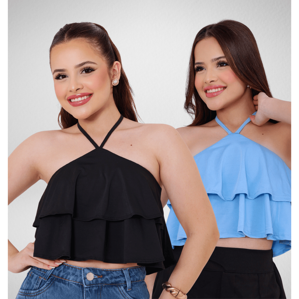 Kit 2 Croppeds Feminino Juvenil Top Faixa com Babados e Forro Amarração no Pescoço pra Adolescente