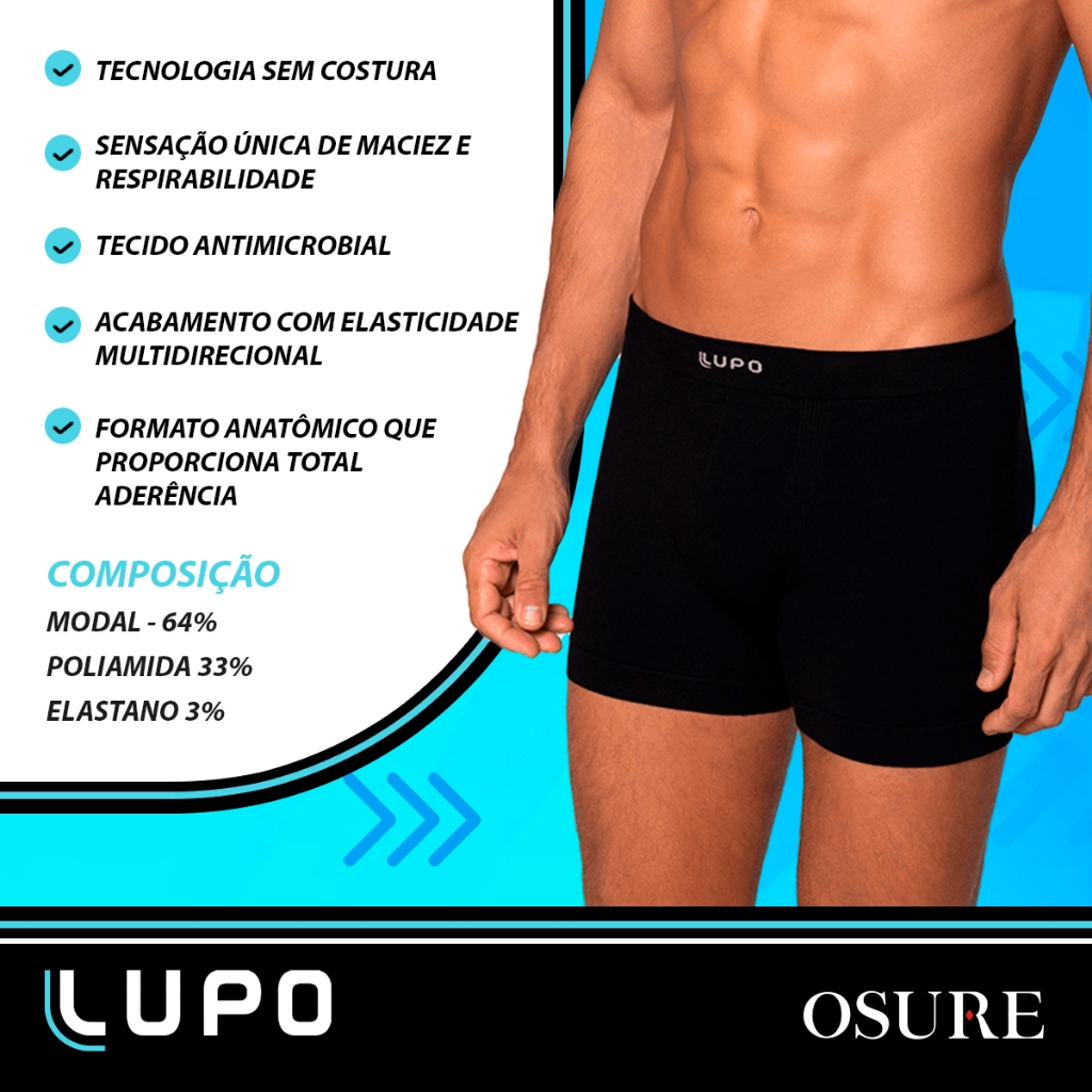 ITENS INCLUSOS: - 2 Cuecas Lupo Boxer Micromodal Sem Costura - Ref: 661 Produto 100% original, com garantia e nota fiscal. DESCRIÇÃO DO PRODUTO: A Cueca Boxer Lupo tem comprimento alongado, definindo melhor o púbis, glúteos e coxas. Seu formato anatômico oferece ótimo conforto, e a malha elástica garante ajuste perfeito. Disponível em cores discretas e versáteis, utiliza tecnologia moderna para reduzir fricção e superaquecimento. A ventilação em áreas críticas promove conforto térmico, transferindo calor e umidade do corpo para o ambiente. CARACTERÍSTICAS: - Antimicrobial - Tratamento de Higienização. - Peça proporciona uma sensação única de maciez e respirabilidade - Malha com Elasticidade para Ajuste Perfeito. - Acabamento com Elasticidade Multidirecional. - Conforto, qualidade e estilo em suas roupas íntima. TAMANHOS: COMPOSIÇÃO: - Modal 64% - Poliamida 33% - Elastano 3% POSTAGEM: Se o pagamento for confirmado até as 11:00, postamos o pedido no mesmo dia. Exceto sábados, domingos e feriados. INSTITUCIONAL: Há mais de 10 anos no mercado oferecendo a melhor experiência, a Osure é líder de vendas nos marketplaces e continua crescendo mês a mês, sempre prestando um bom atendimento a um preço justo. São mais de 2 milhões de pedidos e clientes bem atendidos. Trabalhamos somente com produtos originais e priorizamos a agilidade na entrega do produto e qualidade no atendimento, visando proporcionar a melhor experiência possível para nossos clientes.