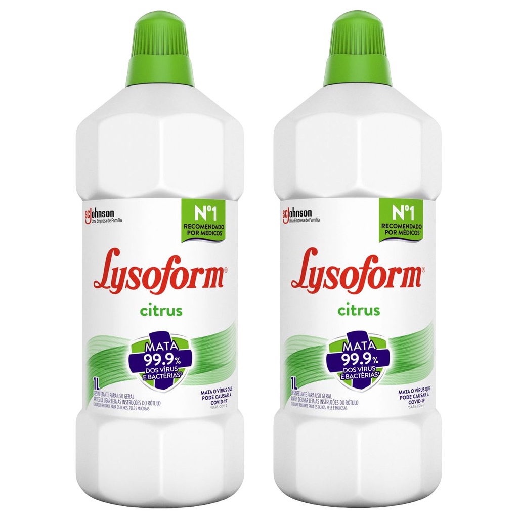 Kit Contém: 2 Desinfetante Lysoform Uso Geral Citrus 1l Lysoform Desinfetante Líquido é um desinfetante confiável, que mata 99,9% dos germes, bactérias e fungos. A marca mais recomendada por médicos para desinfetar sua casa, para que você possa aproveitar todos os momentos sem preocupações. Instruções Desinfecção: Aplique e deixe agir por, no mínimo, 10 minutos. Vasos sanitários: Coloque Lysoform sobre uma reborda interna e nas paredes laterais do vaso sanitário. Lixeiras e ralos: Coloque Lysoform e deixe agir. Perfumação: Aplique Lysoform diluído. Use duas colheres de sopa (25ml) por litro d’água em pisos, azulejos e superfícies laváveis. Não é preciso enxaguar. Antes de usar sobre qualquer superfície, teste em uma pequena área. Lavagem de roupas (apenas no caso das versões Original e Suave Odor): Utilize meio copo americano (90ml) de Lysoform no processo final de lavagem. Não é necessário enxaguar. Testar em uma pequena área escondida do tecido antes de usar para certificar-se de que não mancha. Lave em água corrente os objetos usados como medida antes de reutilizá-los para outros fins.