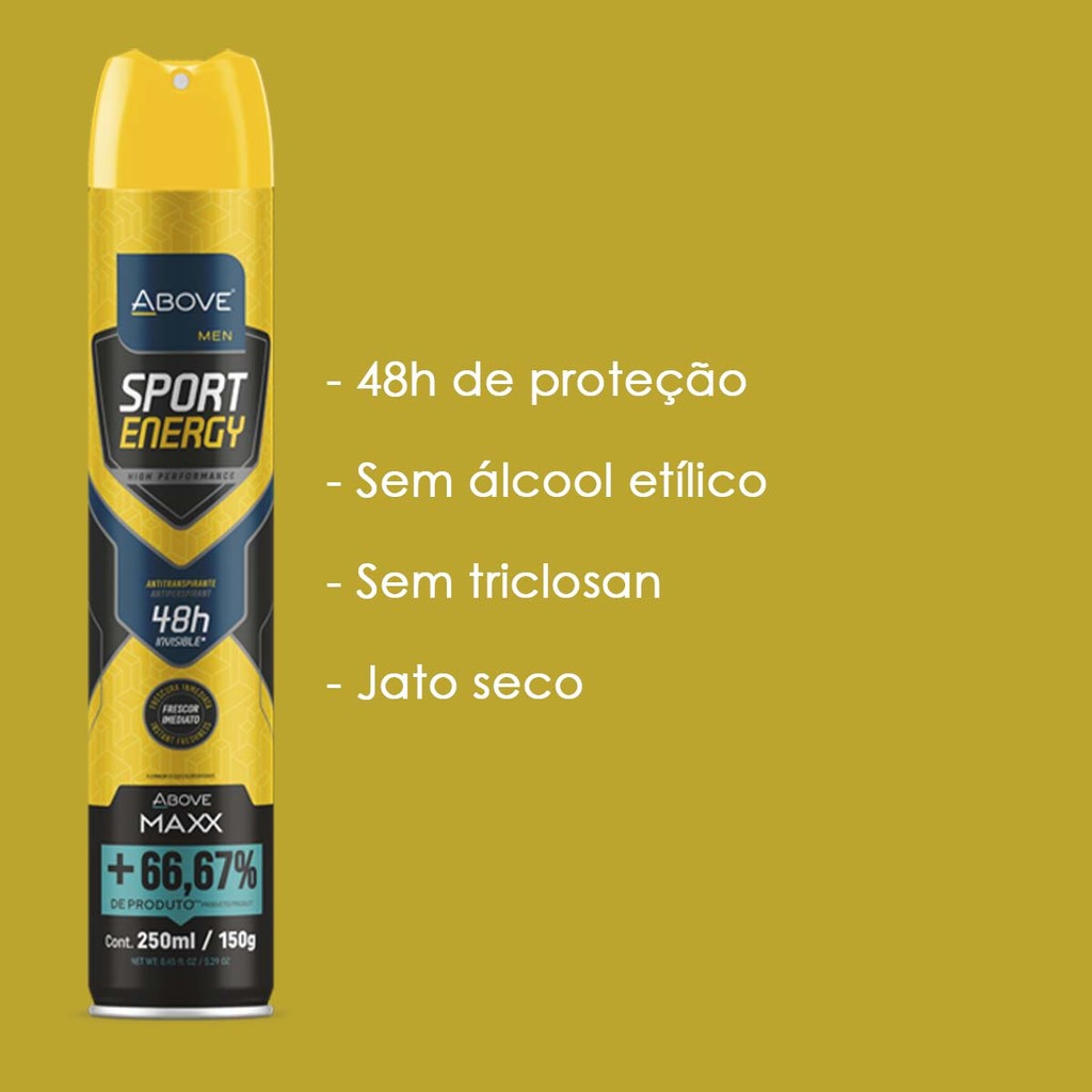Kit 2 und Desodorante Above Aero 250ml Maxx Sport Energy Men- 48 Horas de Proteção; - High Performance; - Proteção Seca; - Ajuda na eliminação de Odores; - Frescor Imediato.