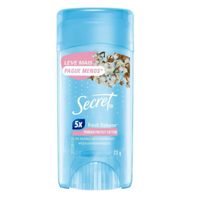 O Secret é um desodorante em gel invisível que auxilia no combate ao suor nas axilas. Sua fórmula conta com tecnologia que detecta o mau cheiro e o bloqueia, prevenindo o acúmulo de bactérias e proporcionando 48 horas de proteção contra odores corporais intensos com sensação de frescor. Secret em Gel Cotton Powder Protect tem uma fragrância suave de algodão e possui aplicação transparente, que oferece uma proteção superior contra o suor e o mau odor. É anti-manchas, não deixa manchas brancas na aplicação, além de contar com secagem rápida e um cheiro agradável. Benefícios e diferenciais Evita manchas e protege roupas pretas ou de cor mais escura. Embalagem fácil de carregar na bolsa ou mochila. Seca rápido e tem uma fragrância agradável. Previne o acúmulo de bactérias. Rápida absorção. Como usar o Desodorante Secret Powder Protect Cotton Gel Invisível? Remova o lacre de segurança. Gire o disco da base até o produto aparecer. Aplique nas axilas e depois feche bem.
