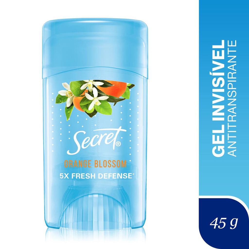 Kit contém: 2 Desodorantes em Gel Secret Orange Blossom 45g Da Um Check Wow, Voce vai amar!O Desodorante Secret Gel feminino Orange Blossom protege a sua pele contra o suor e o mau cheiro nas axilas deixando-a suave e macia. Com seu formato desodorante em gel, proporciona uma proteção duradoura desde o primeiro uso. Por ser um desodorante em gel invisivel não deixa manchas brancas nem resíduos nas roupas. Além disso, a sua fragrância cítrica, suave e exótica lhe proporcionará uma sensação de frescor durante todo o dia.Esse desodorante antitranspirante em gel brinda uma proteção completa que se adapta à sua rotina, pois, controla o suor provocado pelo calor, pelo estresse e por atividades físicas. Além disso, Secret é uma marca livre de crueldade animal certificada pela PETA. Para usar o desodorante antitranspirante Secret Gel Orange Blossom, remova o selo de segurança, use de 2-3 clicks por axila, e aplique diariamente apenas na região das axilas, não esquecendo de manter o frasco bem fechado após o uso.Desde 1956 Secret apoia as mulheres a demonstrarem o melhor de si, com uma hidratação e proteção contra o suor e odor nas axilas que contribuem com a confiança que elas necessitam para assumir qualquer desafio. • Protege a sua pele contra o suor e o mau cheiro nas axilas deixando-as suave e macia • Sua textura em gel invisivel proporciona uma proteção duradoura desde o primeiro uso sem deixar manchas brancas nem resíduos na roupa • Possui uma fragrancia citrica, suave e exotica que mantém uma sensaão de frescor durante todo o dia • Controla o suor provocado pelo calor, pelo estresse e por atividades físicas. Além de ser é uma marca livre de crueldade animal certificada pela PETA • Fácil de aplicar, basta aplicar 2-3 clicks diretamente apenas na região de cada uma das axilas