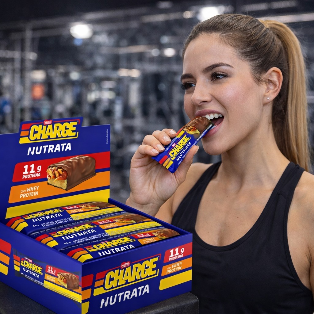 A Nutrata e a Nestlé se unem em uma collab que nasce da busca constante por inovação e qualidade. O Charge Nutrata reúne chocolate ao leite, caramelo e amendoim com proteínas de alta qualidade. Disponível na versão de 45g, oferece 11g de proteína provenientes do whey protein, sem adição de açúcares e zero glúten, o produto foi desenvolvido para preservar sabor e textura característicos do Charge®, ao mesmo tempo em que atende às necessidades de consumidores que buscam uma fonte funcional de proteínas para o consumo diário. ------------------------------------------------------------------------------------------ Posso consumir em meu processo de emagrecimento? ------------------------------------------------------------------------------------------ Sim, pode! As barras de proteína são uma excelente opção para os dias mais corridos, em que precisamos de algo prático, mas ainda nutritivo e proteico. -------------------------- Contém glúten? -------------------------- Celíacos e intolerantes podem consumir a barra Charge Nutrata, pois ela não contém glúten na composição e não há risco de contaminação cruzada durante o processo de fabricação. --------------------- Ingredientes: --------------------- Recheio sabor caramelo (maltitol, polidextrose, gordura vegetal, leite em pó desnatado, cacau em pó, aromatizantes, emulsificante lecitina de soja, espessante pectina, edulcorante glicosídeos de esteviol de Stevia rebaudiana Bertoni e corante extrato de urucum, base norbixina), cobertura sabor chocolate ao leite (gordura vegetal, soro de leite em po, cacau em pó, edulcorante maltitol, emulsificante lecitina de soja, conservante sorbato de potássio e aromatizante), amendoim torrado, colageno hidrolisado, proteína de soro do leite concentrada, caseinato de cálcio, proteína concentrada de leite obtida de leite bovino, pasta de amendoim, gordura de palma, frutooligossacarídeos (FOS), proteína de soro do leite isolada, polidextrose, edulcorante xarope de maltitol, umectante glicerol, emulsificantes lecitina e goma acácia, aromatizantes, antiumectante fosfato tricálcico e antioxidante di-alfa-tocoferol. ALÉRGICOS: CONTÉM AMENDOIM E DERIVADOS DE LEITE E SOJA. PODE CONTER AMÊNDOA, AVELÁS, CASTANHA-DE-CAJU, CASTANHA-DO-BRASIL, NOZES, OVOS E PISTACHES. CONTEM LACTOSE. NÃO CONTÉM GLÚTEN.