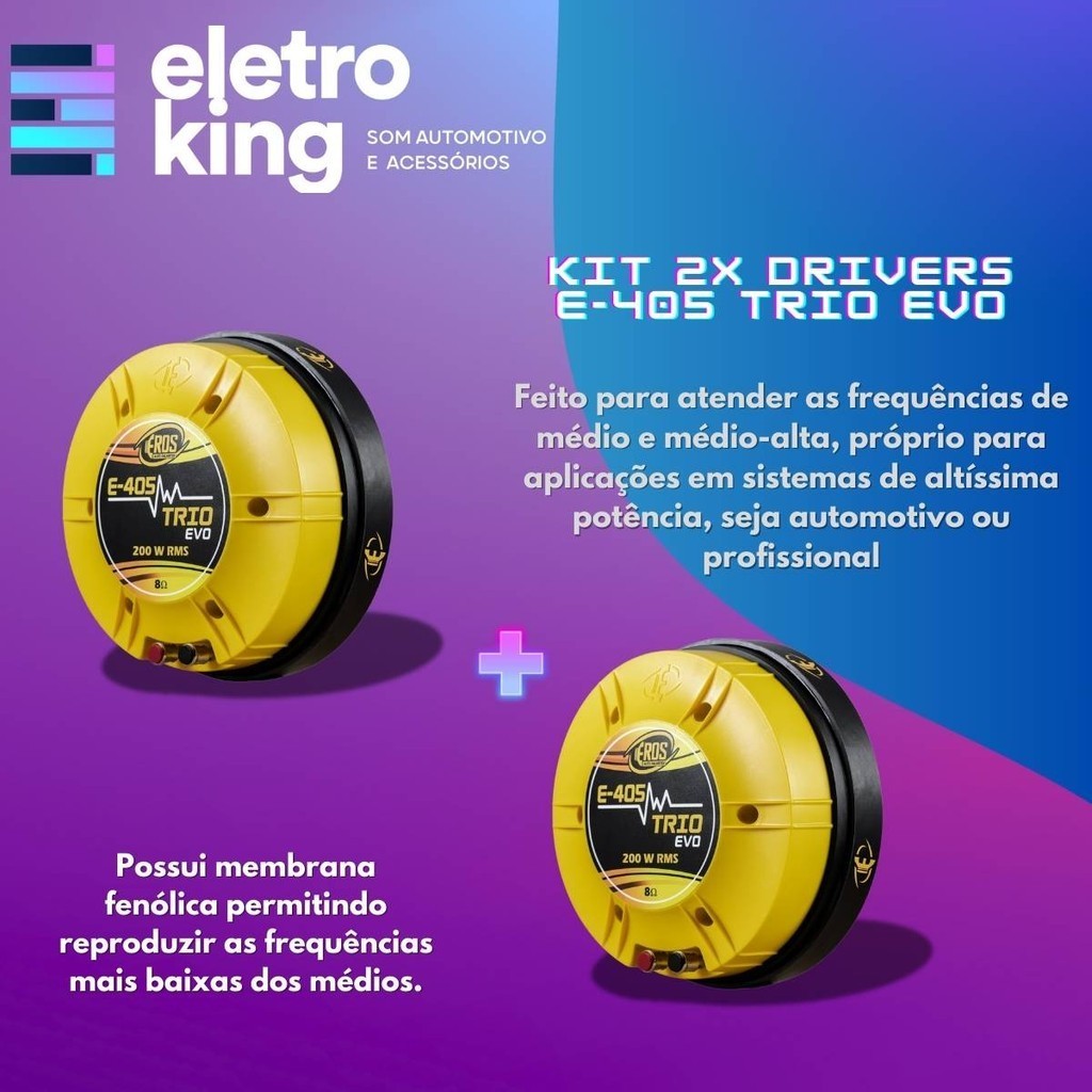 | Kit 2 Driver Eros E405 Trio Evo Fenólico 200 Watts 8 Ohms este produto | R$ 1.759,80 | — | 5.0/5 | — |