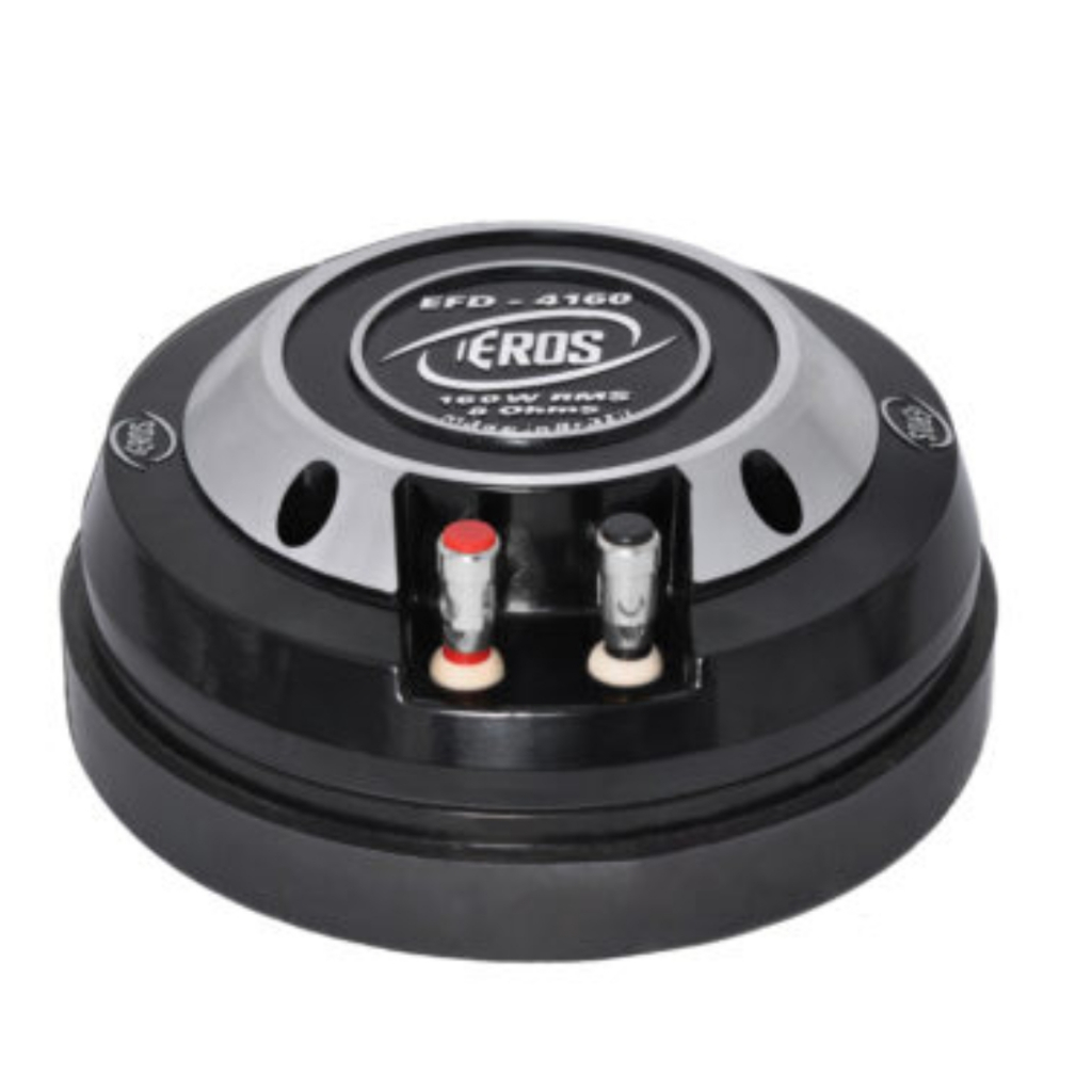 O Driver fenólico de som automotivo é responsável para reproduzir frequências medias altas e agudas baixas (região da voz humana e maioria de instrumentos musicais). Geralmente é utilizado em sistemas externos, juntamente super tweeters (que reproduz os agudos altos e complementa a qualidade do sistema. O Driver Eros EFD 4160 possui 160 RMS de potência, resposta de frequência de 30 á 9000hz e sensibilidade de 110bB, sendo o driver mais forte da marca. Possui conjunto mecânico feito em resina fenólica, com bobina de 100mm de diâmetro (forma de kapton e enrolamento de cobre) e boca de 50mm, gerando alta compressão em seu funcionamento e consequentemente alto desempenho na reprodução da "voz". Foi projetado pela Eros alto falantes , após extensos testes realizados e com toda a experiência da fabricante em campeonatos de som automotivo. É perfeito para quem tem um sistema de som externo e quer alto desempenho e qualidade sonora, além de ter em sua disposição, toda a rede de assistência técnica de uma das maiores fabricantes de alto falantes do Brasil! Para ter total aproveitamento do Driver EFD 4160 é recomendável utilizar um corte HPF de 500hz (ou superior), utilizando um crossover, divisor de frequência ou capacitor 22uf. - Especificações Técnicas Resposta de frequência: 300 a 9.000Khz Impedância nominal: 8 Ohms Potência RMS de CADA: 160 watts Potência RMS do PAR: 320 watts Sensibilidade (1w/1m): 110Db SPL Crossover recomendado: 500 hz - 12 db / oitava Diâmetro da garganta: 50 mm Diâmetro da bobina: 100 mm Material do diafragma: Resina fenólica Fio da bobina: Alumínio (CCAW seção chata) Material da forma da bobina: Kapton Material do ferrite: Bário