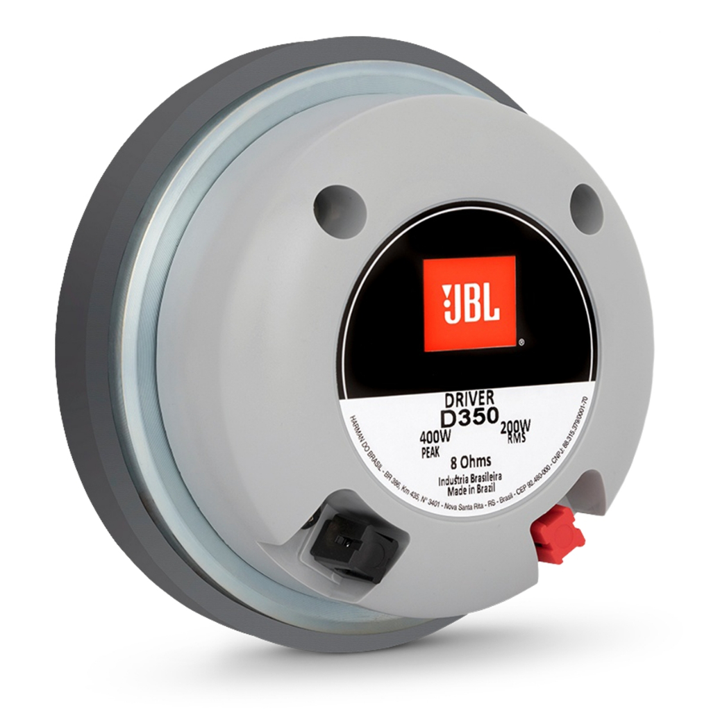 DRIVER JBL D350 PANCADAO O Driver JBL D350 Pancadão é a solução ideal para sistemas de médio e grande porte. Projetado para responder com clareza e precisão nas médias e altas frequências, o D350 conta com incrível desempenho, suportando até 200W RMS.O Driver pode ser acoplado a uma corneta, sendo a combinação perfeita entre elegância, alta potência e qualidade. Especificações Técnicas: - Diâmetro da garganta: 2"" ou 50mm - Fixação: Parafuso - Impedância: 8 Ohms - Resposta de Frequência (Hz): 600Hz - 7600Hz - Material do Diafragma: Fenólico - Material do Ferrite: Bário - Potência Real Total (Watts RMS) (CADA): 200 - Potência Real Total (Watts RMS) (PAR): 400 - Sensibilidade (dB): 110 - Peso Aproximado do Produto (kg): 3.78 - Dimensões: 77 x 155 x 155 mm