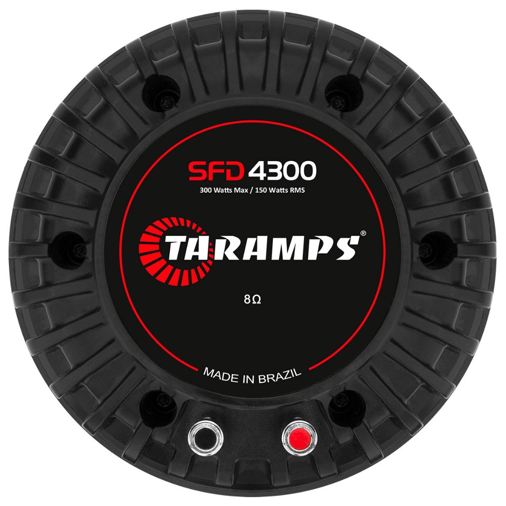 O SFD-4300 é um Driver de Compressão com membrana em resina fenólica desenvolvido para ser um grande aliado na inteligibilidade do seu sistema de som automotivo, proporcionando timbres limpos e muito bem definidos dos médios aos médios agudos. É construído estrategicamente associando design e resistência na sua câmara externa, com resultados surpreendentes em qualquer uma das suas aplicações, suportando alta potência e deslocamento, dentro da sua especificação mecânica. Eficiência, design, robustez e performance são sinônimos deste produto! Mergulhe no mundo do som automotivo com o Grupo Taramps! Informação Técnica • Potência RMS DE CADA: 150W • Potência RMS DO PAR: 300W • Impedância Nominal: 8 Ohms • Sensibilidade Média (@ 1W, 1m): 112 dB SPL • Densidade do Fluxo no Gap: 19.200 GAUSS • Resposta de Frequência (-10dB): 300Hz - 6000Hz • Freq. de Corte Mínima Recomendada (24 dB/8a Ativo): 500Hz • Fio da Bobina: Cobre Redonda • Forma da Bobina: *Kapton® • Material do Ferrite: Bário • Diâmetro da Garganta: 50mm • Material do Diafragma: Fenólico • Diâmetro da Bobina: 100mm • Peso: 7,700 Kg