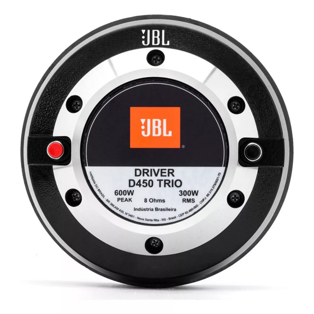 A linha JBL TRIO dispõe de drivers de alta sensibilidade e baixa distorção, com diafragma fenólico tipo domo que garante eficiência e durabilidade mesmo quando exposto a grandes deslocamentos devido as altas potências. Pode ser utilizado em caixas de reforço de som (PA), monitoras e caixas de retorno (palco e sidefill). O driver possui garganta de 50 mm de diâmetro permitindo acoplagem direta à cornetas com o mesmo diâmetro de garganta média. Especificações Gerais • Potência RMS: 300W • Impedância Nominal: 8 Ohms • Resposta de Frequência do Sistema: 400 a 6000 Hz • Sensibilidade 1W@1m: 111 dB • Diafragma Fenólico • Material da Base e da Tampa: Alumínio • Diâmetro da Garganta: 50mm • Peso do falante: 7,8 Kg • Peso do conjunto magnético: 6800g • Peso do imã: 2640g • Dimensões: 20,5 x 20,5 x 9,1 cm Qual o conteúdo da caixa? • 2x Driver D450 TRIO • Folheto Técnico • Folheto Garantia