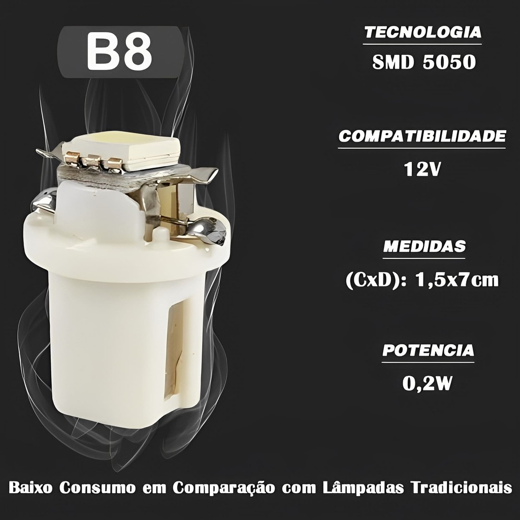 Compacta e potente, pois consome menos bateria e tem excelente durabilidade. Lâmpada T5 B8.5, é leve e impermeável, pois é feita de plástico. Feita na medida exata para soquete T5 B8.5 12V, essa lâmpada LED é capaz de iluminar por completo o Painel de seu veiculo com qualidade e eficiência. Especificação Técnica: • Encaixe T5 B8.5 • Serve para luzes do painel, luz lateral, indicador • Material da Carcaça: Plástico • Não Esquenta • Proteção Contra Tensão Reversa • Tipo LED 5050 • Lumen: cerca de 10 lumem • Consumo de energia: 0.2w • Estilo Light: Luz indicadora • Fácil Instalação • Longa Durabilidade • Ultra Brilhante • Economia de Energia • Impermeável • 12 Volts • Angulo de Iluminação 180° • Tamanho: 15mm / 12mm / 7mm Conteúdo da embalagem: • 2 A 10 Lâmpadas INFORMAÇÕES: - Regular as travas levemente para travar no Painel; - Não forçar para encaixar, se não encaixa de primeira tirar e mexer nas travas levemente; - Se ao conectar e Travar,não ligar, tirar a lâmpada e conectar novamente; - As Lâmpadas tem Polo Positivo e Negativo, então só vai dar contato em 1 posição; Recomendamos a instalação com um Profissional; *APLICACAO NO PAINEL* . Chevrolet Astra 1995 Importado usa 5 no Painel . Chevrolet Astra 1999 ate 2011 (So serve em Painel Fundo Branco, usa 3 no Painel) . Chevrolet Celta 2001 ate 2004 Sem Conta. giros usa 1 no Painel . Chevrolet Celta 2003 ate 2006 Com Conta. giros usa 3 no Painel . Chevrolet . Corsa Classic Com Conta. giros Usa 3 no Painel . Chevrolet . Corsa Novo 2002 ate 2011 usa 3 no Painel . Chevrolet . Corsa Pick. up Com Conta. giros usa 3 no Painel . Chevrolet . Corsa Wagon Com Conta. giros Usa 3 no Painel . Chevrolet . Corsa Wind Com Conta. giros Usa 3 no Painel . Chevrolet . Corsa Wind Sem Conta. giros NAO SERVE no Painel . Chevrolet Kadett Painel ANALOGICO usam Varias . Chevrolet Kadett Painel DIGITAL NAO SERVE . Chevrolet Meriva 2002 ate 2011 usa 3 no Painel . Chevrolet Montana 2004 ate 2010 usa 3 no Painel . Chevrolet Monza 1982 ate 1996 usa 2 no Painel . Chevrolet Omega 1993 a 1998 Painel ANALOGICO Usam Varias . Chevrolet Omega 1993 a 1998 Painel DIGITAL NAO SERVE . Chevrolet Tigra usa 3 no Painel . Chevrolet Vectra A 1994 a 1995 usa 6 no Painel . Chevrolet Vectra B 1997 ate 2005 NAO SERVE no Painel . Chevrolet Vectra C 2006 ate 2011 (So Expression usa 3 no Painel) . Chevrolet Zafira 2001 ate 2012 usa 3 no Painel . Volkswagen Crossfox 2005 ate 2009 usa 2 no Painel . Volkswagen Fox 2004 ate 2012 Usa 2 no Painel . Volkswagen Gol Bola (G2): Usa 2 no Painel . Volkswagen Gol G3: Usa 2 no Painel . Volkswagen Gol G4: Usa 2 no Painel . Volkswagen Gol Quadrado: Usa 2 no Painel . Volkswagen Parati Bola (G2): Usa 2 no Painel . Volkswagen Parati G3: Usa 2 no Painel . Volkswagen Parati G4: Usa 2 no Painel . Volkswagen Parati Quadrado: Usa 2 no Painel . Volkswagen Santana 1984 ate 2004 Usa 2 no Painel . Volkswagen Saveiro Bola (G2): Usa 2 no Painel . Volkswagen Saveiro G3: Usa 2 no Painel . Volkswagen Saveiro G4: Usa 2 no Painel . Volkswagen Saveiro Quadrado: Usa 2 no Painel . Volkswagen SpaceFox 2005 ate 2009 Usa 2 no Painel . Volkswagen Voyage Quadrado: Usa 2 no Painel *APLICACAO NO A VENTILACAO / AR CONDICIONADO* . Chevrolet Astra 2001 ate 2006 Usa 2 no Ar Condicionado Analógico . Chevrolet Celta 2001 ate 2010 usa 1 no Controle da Ventilação . Chevrolet Prisma 2007 ate 2011 usa 1 no Controle da Ventilação . Renault Logan usa 2005 ate 2009 no Controle da Ventilação . Renault Sandero 2005 ate 2009 Usa 2 no Controle da Ventilação *APLICACAO PARA HODOMETRO DIGITAL DE KM)* . Chevrolet Astra 1999 ate 2011 usa 1 . Chevrolet Celta 2007 ate 2010 usa 1 . Chevrolet . Corsa Classic 2002 ate 2010 usa 1 . Chevrolet . Corsa Novo 2002 ate 2011 usa 1 . Chevrolet Meriva 2002 ate 2011 usa 1 . Chevrolet Montana 2004 ate 2010 usa 1 . Chevrolet Prisma 2007 ate 2011 usa 1 . Chevrolet Vectra B 1997 ate 2005 usa 1 . Chevrolet Vectra C 2006 ate 2011 (So Expression usa 1) . Chevrolet Zafira 2001 ate 2012 usa 1 *APLICACAO EM COMPUTADOR DE BORDO(TID / MID)* . Chevrolet Astra 1999 ate 2011 usa 2 no TID . Chevrolet Astra 2000 ate 2011 usa 3 no MID . Chevrolet . Corsa Novo 2002 ate 2012 usa 2 no TID . Chevrolet . Corsa Wind / GSI / Super 1994 ate 2000 usa 2 no TID . Chevrolet Meriva 2002 ate 2012 usa 2 no TID . Chevrolet Montana 2004 ate 2010usa 2 no TID . Chevrolet Vectra B 1997 ate 2005 usa 2 no TID . Chevrolet Vectra B 1997 ate 2005 usa 4 no MID . Chevrolet Vectra C 2006 ate 2012 usa 2 no TID . Chevrolet Vectra C 2006 ate 2012 usa 3 no MID