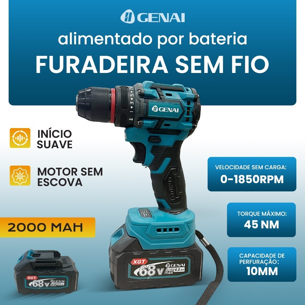Este kit de ferramentas elétricas da é alimentado por bateria de íons de lítio 68V, oferecendo alto desempenho e portabilidade. Ideal para profissionais e entusiastas de DIY, inclui uma furadeira sem fio e uma rebarbadora com motor sem escova, garantindo eficiência, durabilidade e operação contínua sem superaquecimento. Com design leve e partida suave, é perfeito para tarefas demandingas em diversos ambientes. Parâmetros Principais: Furadeira Sem Fio: Velocidade sem carga: 0-1850 RPM Torque máximo: 70 Nm Capacidade de perfuração: 10 mm Bateria: 2000 mAh (integrada ao tool) Rebarbadora: Diâmetro do disco: 115 mm Velocidade sem carga: 3000-9000 RPM Abertura da lâmina de serra: 22 mm Bateria: 2000 mAh (integrada ao tool) Especificações Técnicas: Voltagem: 68V Tipo de Motor: Sem escovas (brushless) Baterias: 2x baterias de íons de lítio recarregáveis, capacidade 6 Ah (compatível com o sistema XGT) Carregador: Incluído, com carregamento rápido Proteções: Contra superaquecimento, partida suave Peso: Leve e compacto (detalhes exatos não fornecidos, mas otimizado para manejo fácil) Durabilidade: Alto torque, baixo consumo de energia, vida útil prolongada Cenários de Uso Prático: Construção Civil: Perfuração em madeira, metal e concreto; corte e desbaste de materiais. DIY e Reformas Domésticas: Ideal para montagem de móveis, reparos elétricos e projetos de artesanato. Oficinas Mecânicas: Usado para polir, lixar ou cortar peças automotivas. Jardim e Exteriores: Ajuste de cercas ou manutenção de estruturas. Acessórios Incluídos: 1x Furadeira sem fio 1x Rebarbadora 2x Baterias de íons de lítio 68V 6Ah 1x Carregador de voltagem dupla