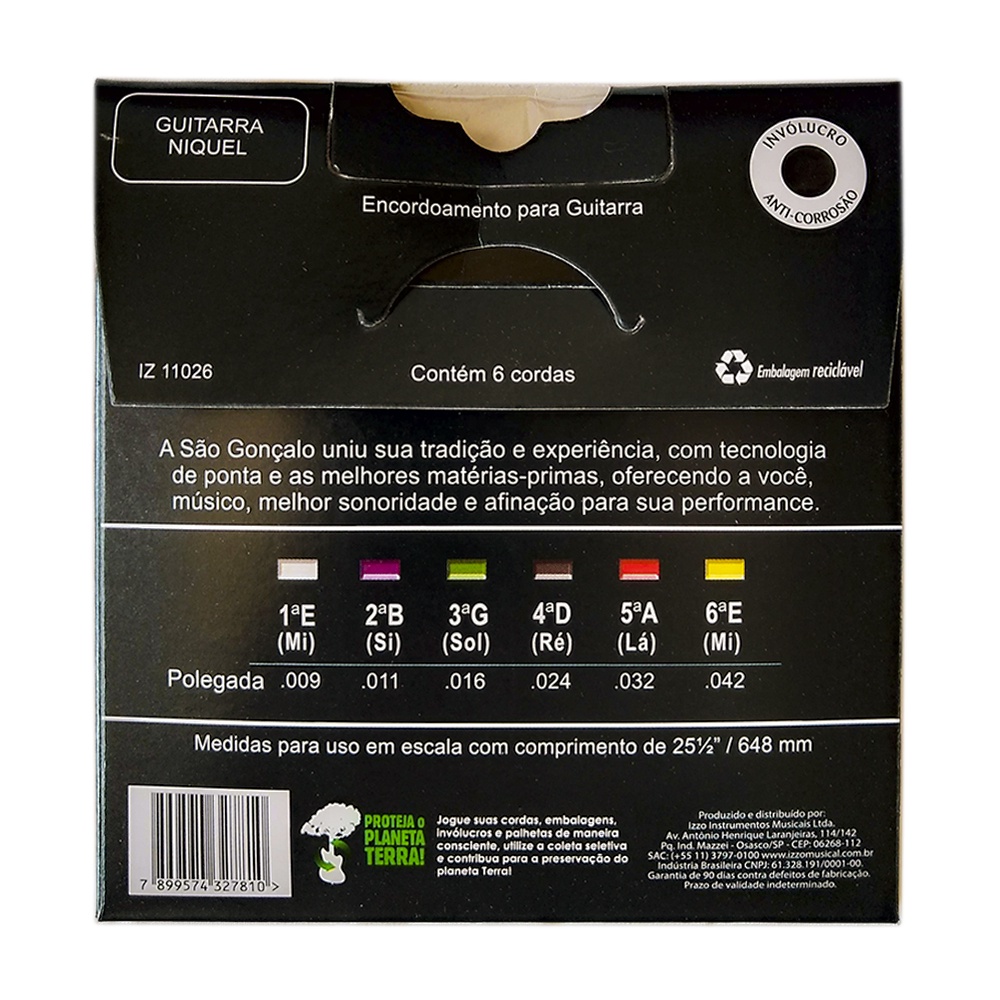 Kit com 2 Encordoamentos + 1 Encordoador + 1 Porta Palhetas O Encordoamento São Gonçalo para Guitarra Elétrica é fabricado no Brasil. São acessíveis e proporcionam brilho e qualidade no seu som, principalmente para músicos iniciantes e estudantes. Seu encordoamento é acomodado em embalagem selada para assegurar a originalidade do produto, o que evita falsificações e impede a oxidação dar cordas pelo contato com o oxigênio. Produto Original fornecido pela Izzo Instrumentos Musicais. Tipos de Instrumento onde se pode utilizar: - Guitarra Elétrica 6 Cordas Calibre da Cordas (Bitola/Espessura): - 1 - Mi .009 - 2 - Si .011 - 3 - Sol .016 - 4 - Ré .024 - 5 - Lá .032 - 6 - Mi .042 Características do Produto Material: Níquel Cor: Niquelada O Encordoador Manual à Manivela da Izzo é um acessório prático que facilita a troca de cordas do seu instrumento, tornando essa tarefa mais simples e rápida. Independente do tipo de encordoamento de sua preferência, sendo Aço ou Nylon, essa ferramenta se torna indispensável para o Músico que prima pela qualidade sonora e timbre encorpado de cordas sempre novas. Tipos de Instrumento onde se pode utilizar: - Violão Aço - Violão Nylon - Violão 12 Cordas - Viola Caipira - Cavaquinho - Guitarra - Ukulele Características do Produto Material: ABS Cor: Preto Tipo: Manivela O Porta Palhetas em ABS da Izzo é um acessório prático que armazena suas palhetas possibilitando fácil acesso as mesmas. Item indispensável para Músicos que querem ter suas Palhetas sempre a mão. Tipos de Instrumento onde se pode utilizar: - Violão - Violão 12 Cordas - Viola Caipira - Cavaquinho - Guitarra - Ukulele Características do Produto Material: ABS Cor: Preto Tipo: De Mola Fixação: Fita Dupla Face (inclusa e já aplicada, basta remover a fita protetora e colar no lugar desejado) *É aconselhável colar o produto sempre na paste de trás do instrumento. Itens Inclusos: - 1 Porta Palhetas em ABS da Izzo - 1 Encordoador Manual à Manivela da Izzo - 2 Encordoamentos São Gonçalo para Guitarra Elétrica 009 Tensão Super Leve - 11026 - 1 Nota Fiscal Eletrônica Disponibilidade Imediata