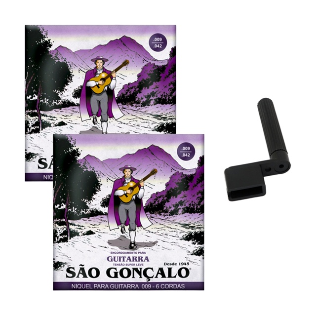 Kit com 2 Encordoamentos + 1 Encordoador O Encordoamento São Gonçalo para Guitarra Elétrica é fabricado no Brasil. São acessíveis e proporcionam brilho e qualidade no seu som, principalmente para músicos iniciantes e estudantes. Seu encordoamento é acomodado em embalagem selada para assegurar a originalidade do produto, o que evita falsificações e impede a oxidação dar cordas pelo contato com o oxigênio. Produto Original fornecido pela Izzo Instrumentos Musicais. Tipos de Instrumento onde se pode utilizar: - Guitarra Elétrica 6 Cordas Calibre da Cordas (Bitola/Espessura): - 1 - Mi .009 - 2 - Si .011 - 3 - Sol .016 - 4 - Ré .024 - 5 - Lá .032 - 6 - Mi .042 Características do Produto Material: Níquel Cor: Niquelada O Encordoador Manual à Manivela da Izzo é um acessório prático que facilita a troca de cordas do seu instrumento, tornando essa tarefa mais simples e rápida. Independente do tipo de encordoamento de sua preferência, sendo Aço ou Nylon, essa ferramenta se torna indispensável para o Músico que prima pela qualidade sonora e timbre encorpado de cordas sempre novas. Tipos de Instrumento onde se pode utilizar: - Violão Aço - Violão Nylon - Violão 12 Cordas - Viola Caipira - Cavaquinho - Guitarra - Ukulele Características do Produto Material: ABS Cor: Preto Tipo: Manivela Itens Inclusos: - 1 Encordoador Manual à Manivela da Izzo - 2 Encordoamentos São Gonçalo para Guitarra Elétrica 009 Tensão Super Leve - 11026 - 1 Nota Fiscal Eletrônica Disponibilidade Imediata