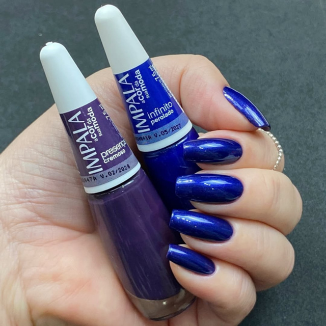 Kit 2 Esmaltes Impala – Infinito e Presença Realce sua beleza com esse duo de esmaltes Impala que une intensidade e sofisticação! Os esmaltes Infinito e Presença fazem parte da coleção nova, inspirada em sentimentos profundos e conexão com o presente. Infinito – Um tom azul petróleo cremoso, marcante e elegante. Traz profundidade às unhas com um toque moderno e poderoso. Ideal para quem ama cores intensas com acabamento uniforme e brilho duradouro. Presença – Um roxo cremoso, delicado e versátil. Perfeito para quem busca um visual lindo, clean e sofisticado. Combina com qualquer ocasião, do dia a dia a eventos especiais. Com fórmula de alta qualidade, os esmaltes oferecem cobertura uniforme, brilho intenso e secagem rápida. Perfeitos para quem busca praticidade e estilo nas unhas! ✨ Ideal para o dia a dia ou momentos especiais ✨ Combinação versátil: do nude delicado ao azul impactante ✨ Fórmula hipoalergênica e dermatologicamente testada ✨ Pincel fácil de aplicar e resultado profissional Garanta já o seu e deixe suas unhas ainda mais lindas com Impala!