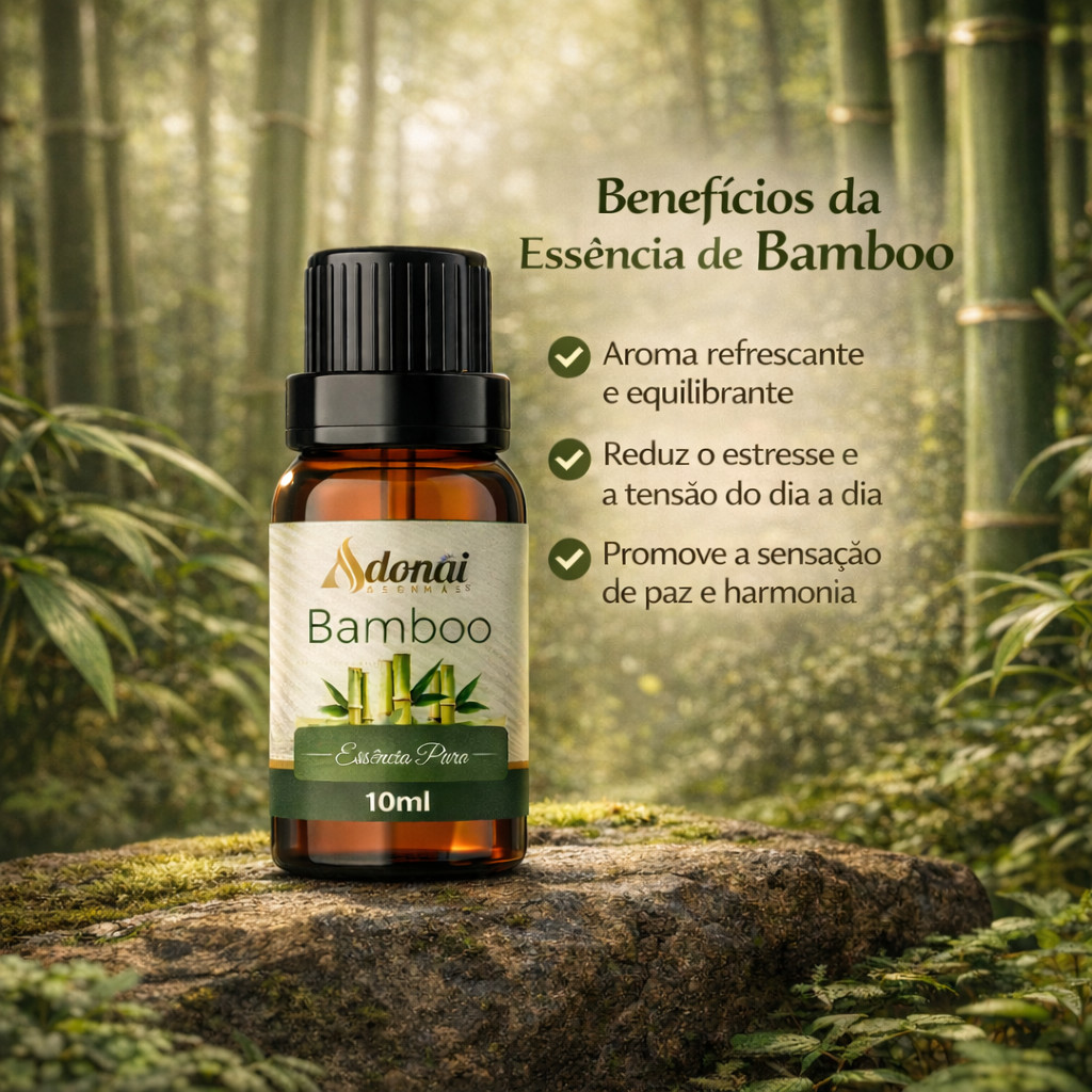 Essência de Bamboo – 10 ml Descrição da essência A Essência de Bamboo é inspirada nas notas aromáticas do bambu, conhecida por seu aroma fresco, verde e levemente amadeirado. É uma essência de uso aromático, muito utilizada para perfumar ambientes e criar uma atmosfera equilibrada, limpa e natural. Seu perfil aromático transmite leveza e sensação de frescor, sendo ideal para ambientes que buscam harmonia, tranquilidade e bem-estar no dia a dia. O frasco em vidro âmbar auxilia na proteção da essência contra a luz, preservando sua qualidade aromática. Benefícios da essência Aroma refrescante e equilibrante para o ambiente Auxilia na criação de uma atmosfera mais leve e agradável Contribui para a sensação de paz e harmonia Pode ajudar a reduzir a sensação de tensão do dia a dia Tradicionalmente utilizada na aromatização de ambientes Modo de usar Uso aromático: aplicar de 3 a 10 gotas em difusores elétricos, aromatizadores ou umidificadores, conforme o tamanho do ambiente Ambientes: pode ser utilizada em sprays aromatizadores ou difusores de varetas Observações importantes Uso externo Não ingerir Não aplicar diretamente sobre a pele Evitar contato com olhos e mucosas Manter fora do alcance de crianças Armazenar em local fresco, seco e ao abrigo da luz