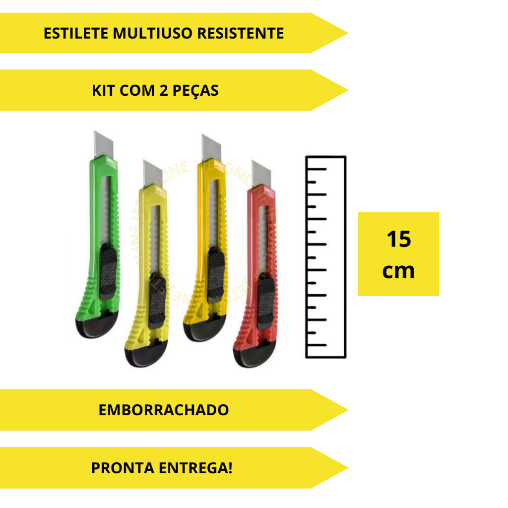 KIT COM 2 ESTILETES DE 15 CM Estilete Metal Profissional 18mm Com Trava Fabricado com corpo de plástico, revestimento de borracha e guia de metal. Lâmina retrátil de 18mm e botão de trava e destrava das lâminas. A substituição da lâmina é bem simples, realizada manualmente pela parte traseira do estilete. Fixação da lamina automática e de parafuso. Substituição da lamina e feita a mão pela parte traseira do estilete. CARACTERÍSTICAS: Lamina de: 18 mm Trabalhamos com cores sortidas, enviaremos a cor de acordo com a disponibilidade de nossos estoques. Nos buscamos um atendimento personalizado visando atender melhor os seus clientes. Emitimos Nota Fiscal tanto para pessoa Física quanto para Pessoa Jurídica Envio imediato