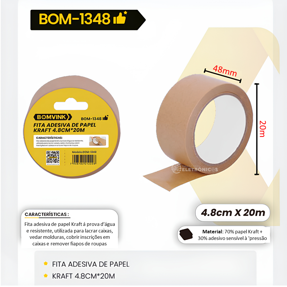 A Fita Kraft Marrom 4,8cm x 20 metros é revestida com adesivo de alta qualidade à base de borracha natural e resinas. Oferecendo excelente resistência à umidade e a prova d’água, ela é ideal para: – Fechamento de pacotes e caixas leves – Reforço de embalagens – Proteção, enfaixamentos e emendas – Emolduramento de quadros – Trabalhos escolares e outras aplicações em papelaria INFORMAÇÕES TÉCNICAS: Modelo: BOM-1348 Composição: Fita de Papel Kraft Crepado Tamanho: 48mm x 20 Metros Conteúdo Da Embalagem: 2 Fitas Adesiva De Papel Kraft 48mm x 20mts – BOM1348 Garantia: Confira O Produto No Ato do Recebimento, Garantia Apenas Contra Defeitos De Fabricação Diretamente Com Fabricante/Fornecedor. Obs. 1: As fotos do anuncio são meramente ilustrativa, as cores podem variar de tonalidade conforme as configurações do seu monitor ou tela. O efeito da foto/vídeo Obs. 2: Todos os produtos são examinados antes do envio, ao receber o produto o usuário deve operá-lo de acordo com as especificações do anuncio, embalagem, manual ou informações do fabricante. A garantia, não poderá ser utilizada, caso o produto apresente sinais de mal uso. Cuidados: Não utilizar produto químico ou material abrasivo sobre o produto.