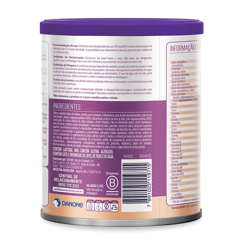 Kit com 2 unidades Infatrini 400g Infatrini é uma fórmula infantil para lactentes e crianças de primeira infância de 0 a 36 meses, destinada a necessidades dietoterápicas específicas com 1 kcal/ml.A indicação de produtos deve ser sempre avaliada pelo profissional de saúde, caso a caso, conforme a situação clínica e nutricional do paciente. Consulte sempre seu profissional de saúde.CONTÉM LACTOSE. NÃO CONTÉM GLÚTEN. ALÉRGICOS: CONTÉM LEITE E DERIVADOS DE LEITE, DE PEIXE E DE SOJA.AVISO IMPORTANTE:ESTE PRODUTO SOMENTE DEVE SER USADO NA ALIMENTAÇÃO DE CRIANÇAS MENORES DE 1 (UM) ANO DE IDADE COM INDICAÇÃO EXPRESSA DE MÉDICO OU NUTRICIONISTA. O ALEITAMENTO MATERNO EVITA INFECÇÕES E ALERGIAS E FORTALECE O VÍNCULO MÃE-FILHO.