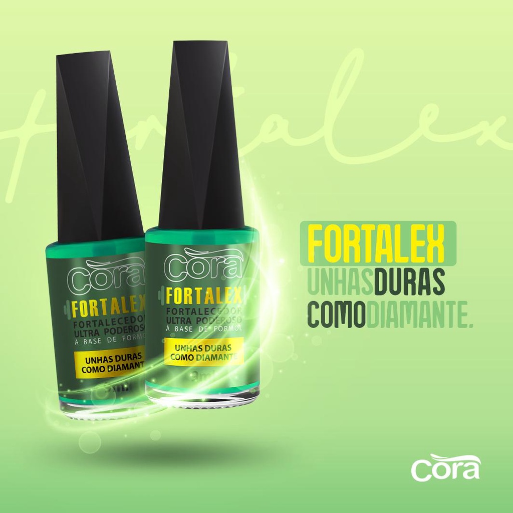Fortalex é o Fortalecedor Ultra Poderoso da Cora, através de sua fórmula exclusiva ele sela as camadas das unhas e ao mesmo tempo dá maior flexibilidade permitindo resolver rapidamente o problema das unhas lascadas ou quebradiçasPara usar o Fortalex basta passar do centro para as pontas das unhas antes de aplicar o esmalte, não é recomendado usar mais de 2 vezes por semana.Fortalex não é base e nem esmalte, é um complexo poderoso com uma fórmula exclusiva contendo D-Pantenol e Formaldeído que fortalecem a ligação da queratina e ao mesmo tempo dão flexibilidade permitindo que a unha cresca mais resistente e forte.O primeiro fortalecedor do mundo que sela as camadas e ao mesmo tempo dá maior flexibilidade para as unhas.Efeitos muito rápidos.Começa a agir instantaneamente selando as camadas das unhas.