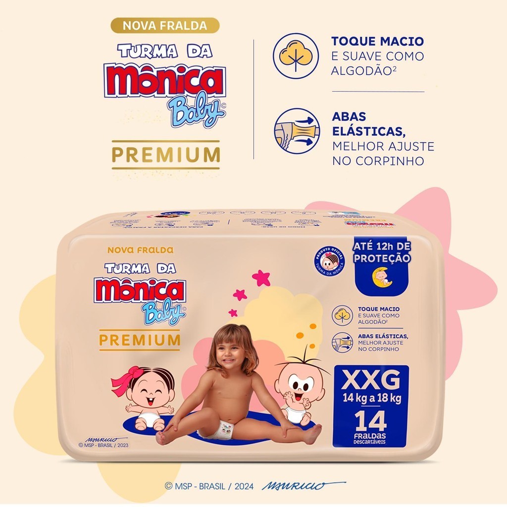 O Kit contém: 2 pacotes de Fraldas Turma da Mônica Baby Premium Jumbo XXG com 14un cada. A nova fralda Turma da Mônica Baby Premium chegou, com até 12 horas de proteção e um toque macio e suave como algodão, garantindo conforto para o seu bebê. Suas abas elásticas proporcionam um melhor ajuste no corpinho, além de ter barreiras antivazamento que oferecem proteção durante o dia e a noite.Uma escolha segura e confortável para um carrinho especial a cada troca.