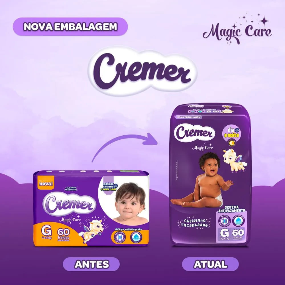 A Fralda Cremer Magic Care agora está mais fina e confortável, oferecendo proteção com um novo sistema antivazamento. Possui uma fita abre e fecha mais flexível e orelhas maiores que se ajustam ao corpo do bebê, com uma camada super absorvente que distribui rapidamente o xixi pela fralda, evitando o retorno do líquido e mantendo a pele do bebê seca. A nova Cremer Magic Care garante proteção para noites tranquilas e dias mágicos. Benefícios:Proteção contra vazamentos e pele seca por até 12 horas, dia e noite.Permite abrir e fechar quantas vezes for necessário sem danificar a fralda.Novas barreiras coloridas, altas e seguras contra vazamentos, que se estendem por toda a lateral da fralda.Distribui rapidamente o xixi pela fralda e evita o retorno do líquido, garantindo que a pele do bebê fique bem sequinha. Modo de usar: Abra e estenda a fralda com os fechos reposicionáveis para cima. Coloque o bebê no centro da fralda e passe a parte inferior da fralda entre as pernas. Fixe os fechos reposicionáveis na faixa frontal, ajustando ao corpo do bebê. Sobre a marca: Cremer é dedicada a oferecer fraldas de alta qualidade para o cuidado dos bebês. As fraldas da Cremer são projetadas para proporcionar noites tranquilas e dias confortáveis para os pequenos, garantindo a tranquilidade dos pais.