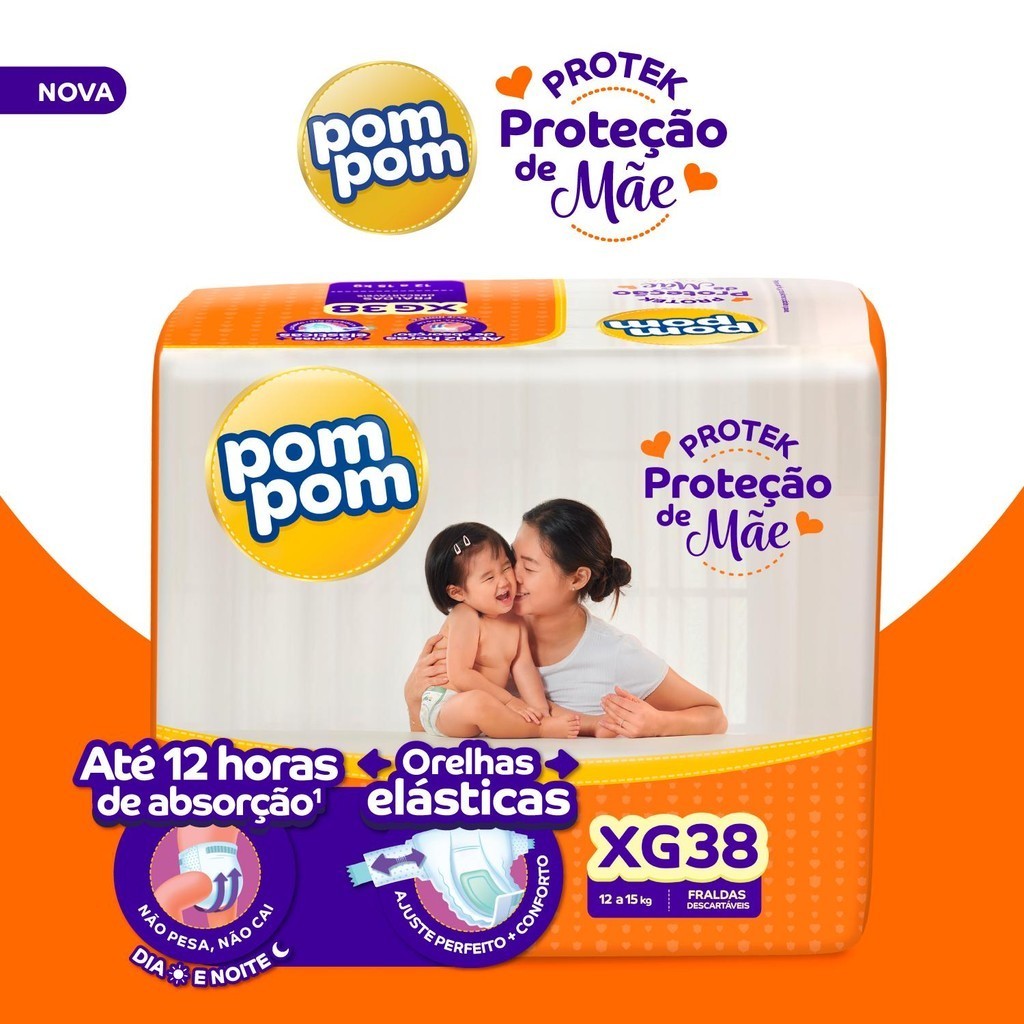 O Kit contém: 2 pacotes de Fraldas Pom Pom Protek Proteção de Mãe Mega XG com 38un cada. Pom Pom Protek Proteção de Mãe é a proteção que cuida do seu bebê por até 12 horas, garantindo dias e noites tranquilas, com orelhas elásticas que garantem mais conforto e um ajuste perfeito na cinturinha do bebê, e canal superabsorvente que distribui o xixi mais rápido, evitando que a fralda pese e caia entre as perninhas do bebê.