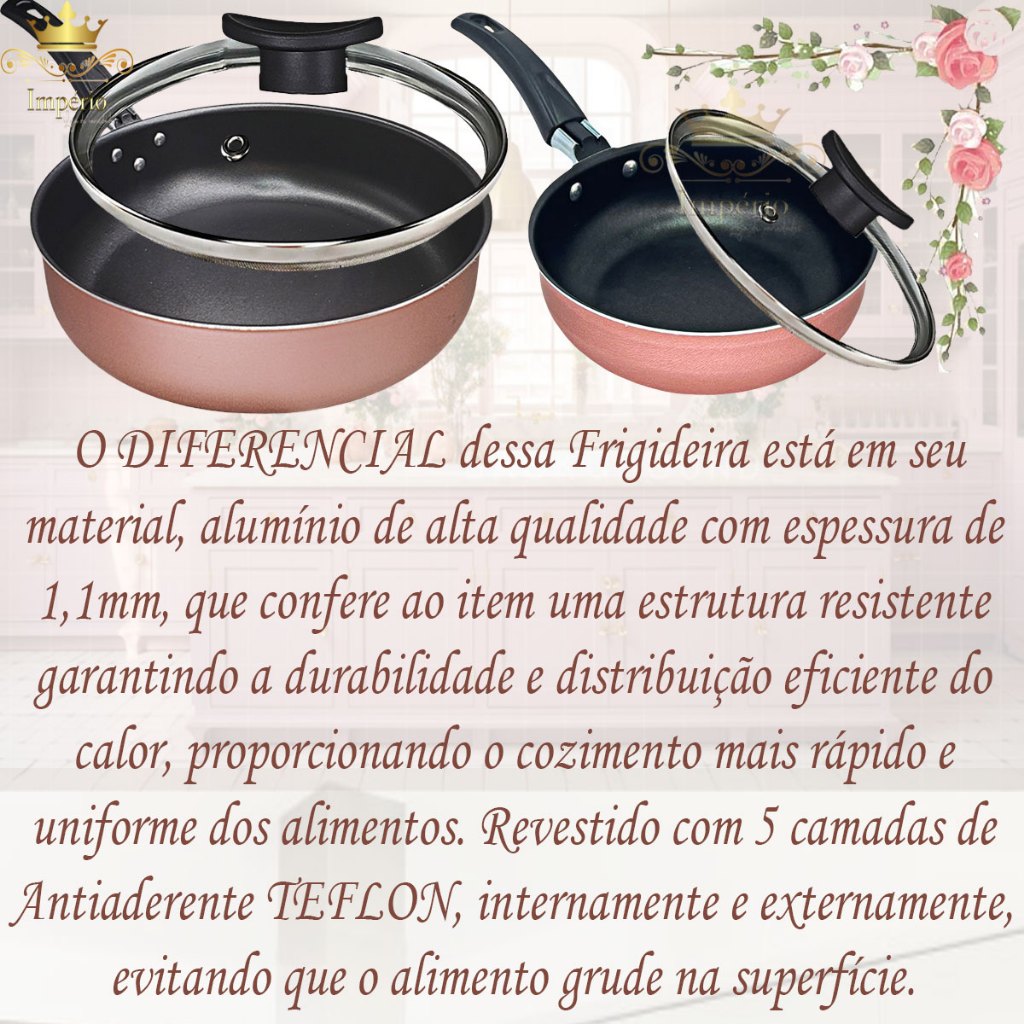 Prazer, somos a “Imperio Variedades”. Confira nossa loja, temos outros modelos, tamanhos e promoções A Arte de Misturas Sabores... Cozinhar é a arte de misturar sabores e encantar, é na cozinha que a mágica acontece, que os amigos se reúnem, que as alegrias se multiplicam... Beleza, charme, praticidade na hora de cozinhar, você vai se encantar, sua cozinha merece esse mimo! Frigideira 24 cm Antiaderente Rosa e Frigideira 18cm14,5 com tampa de vidro temperado com Saída de vapor, o que permite visualizar o processo de cozimento dos alimentos. Design arrojado, beleza e muito charme, o diferencial desse Item, está em seu material, alumínio de alta qualidade, espessura de 1,2 mm, que confere ao item uma estrutura resistente garantindo a durabilidade e distribuição eficiente do calor, proporcionando o cozimento mais rápido e uniforme dos alimentos. Revestido com 5 camadas de antiaderente TEFLON (DuPont) - PFOA Free, internamente e externamente, evitando que o alimento grude na superfície, o que possibilita o preparo dos alimentos com menos gordura, além de proporcionar praticidade no momento da limpeza. Possui cabo reforçado ergonômico, feito em baquelite, material antitérmico que não retém calor, para garantir facilidade e máxima segurança no manuseio. Especificações Técnicas: Dimensões aproximadas - cm: (Altura x Largura x Comprimento - Capacidade volume): - 1 Frigideira Alta 24 cm de diâmetro c/ tampa de vidro - cm 6 x 24 x 40 – 2,4L - 1 Frigideira 18cm de diâmetro c/ tampa de vidro - cm 5 x 18 x 34,5 –1,2L Material: Alumínio Revestido Revestimento Externo: Antiaderente – Cor: Rosa Revestimento Interno: Antiaderente – Cor: Preto Espessura Material: 1,1mm Cabo: Baquelite Tampa: Tampa de Vidro Temperado Peso: 821 g Dimensões Embalagem caixa – cm (A x L x C): 41 x 28 x 8 cm Peso Embalagem - Caixa Parda: 120 g Recomendações: Antes do primeiro uso é necessário realizar a limpeza e a cura do item, imprescindível para durabilidade e proteção da camada antiaderente. Lave com esponja macia e detergente neutro, seque-a com um pano limpo. Unte a parte interna com óleo ou outra gordura e leve-a ao fogo baixo por 2 minuto. Deixe-a esfriar, lave, enxugue e está pronta para utilizar. Cuidados: - Para conservação e durabilidade do seu produto lavar somente om lado macio da esponja; - Evite a imersão do produto quente em água fria. Sempre o deixe esfriar antes de lavar; - Para mexer os alimentos use somente utensílios de silicone ou nylon; - Não exponha as alças e cabos diretamente ao fogo ou fonte de calor prolongado; - Não pode ser levada ao forno e/ou microondas; - Mantenha o produto sobre a chama do fogão apenas o necessário para o cozimento, sempre em fogo baixo ou médio (nunca superior a 350°C). Detalhes: - Garantia 30 dias contra defeitos de fabricação. - Itens decorativos não acompanham o produto. Imagens meramente ilustrativas - A cor do produto pode sofrer alteração de acordo com a qualidade do monitor. - Para descarte dos produtos e embalagens siga as orientações de reciclagem vigente. Estamos à disposição para qualquer dúvida. Agradecemos a sua visita e aguardamos seu pedido!