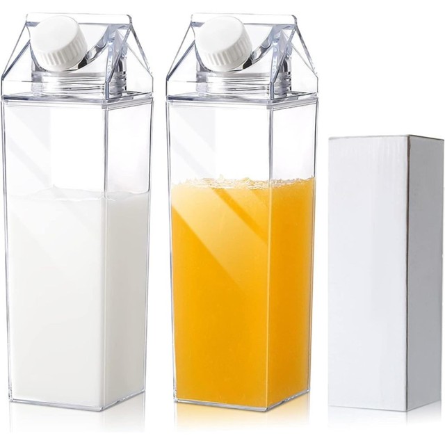 Kit 2 Garrafas Acrílico com Adesivo 1 Litro Caixa Leite Água Suco Geladeira