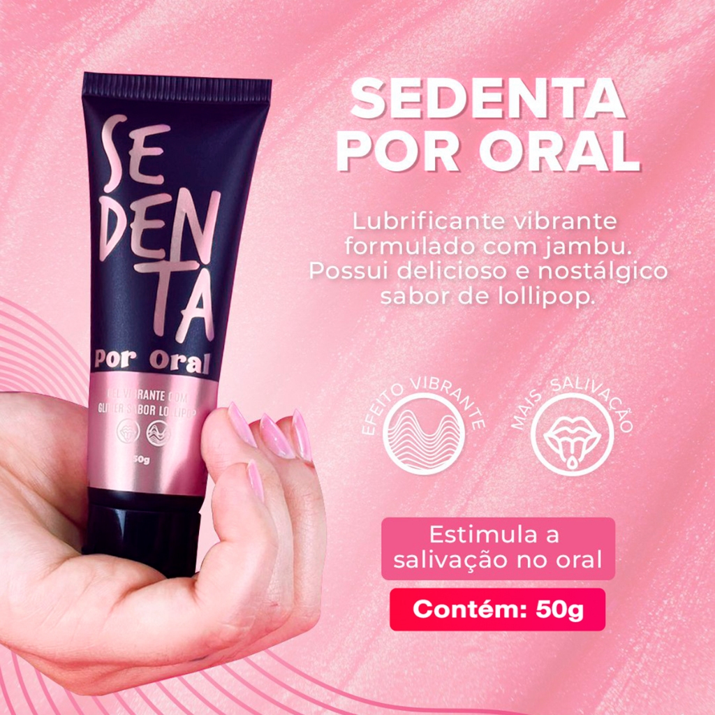 VOCÊ TEM SEDE DE QUÊ? Para alguns, a sede é por experiências, por expandir os horizontes e transformar a sua percepção de vida. Para outros, a sede é por intimidade. Anseian por conexões, afeto e momentos prazerosos. É a sua sede que dará direção e propósito na vida. Seja uma pessoa SEDENTA por aquilo que te dê prazer, que te faça feliz e único. A linha Sedentas foi elaborada para saciar a sede de quem deseja sentir sensações a for da pele muito mais intensas! * Sedenta Molhada Gel Lubrificante Neutro Possui textura semelhante a lubrificação natural íntima e sabor levemente adocicado. Altamente deslizante e boa resistência a água, sendo ideal para penetração vaginal, anal, massagem corpo a corpo e masturbação. Sua formulação é livre de coloração e aromas, sem contra indicações. * Sedenta por Conforto Possui glitter e textura semelhante a lubrificação natural, altamente deslizante e boa resistência a água. Desenvolvido com um blend de matérias primas que hudratam e amenizam o desconforto durante o sexo anal ou garganta profunda. Possui aroma e sabor de cranberry. * Sedenta por Sexo Gel Lubrificante Excitante e Adstringente (Lubrifica, Aquece, Refresca, Vibra e Brilha) Possui glitter e textura com fácil absorção. Formulado com aroma de caju verde e ação adstringente, além de possuir arginina, cravo, mentol e jambu em sua formulação. Seus ativos proporcionam um mix de aquecimento, refrescância e vibração. Aroma e sabor mentolado e lichia. *Sedenta por Oral Lubrifica, Oral, Vibra, Brilho Efeito Vibrante Imediato. Experimente o efeito vibrante que aumenta a salivação e excita, proporcionando uma sensação de formigamento que aumenta o prazer. Sinta o efeito vibrante logo após a aplicação e transforme seus momentos íntimos, ideal para um oral mais molhado ou beijo grego, penetração e masturbação. * Sedenta por 6/9 Bala líquida roll-on Oral, Aquece, refresca, vibra, brilho. Glitter e embalagem com esferas roll-on, ideal para aplicação nos lábios, vulva, pênis e região anal. Um proporciona sensação de aquecimento e sabor chiclete. Aroma e sabor de lollipop