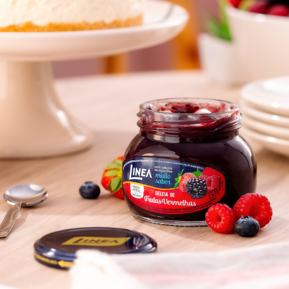 Geleia de Frutas Vermelhas Linea é cremosa, sem adição de açúcar, repleta de sabor e pedaços da fruta. Com as frutas vermelhas como 1º ingrediente, essa delícia é 68% menos calórica que geleias com açúcar. Uma explosão de doçura saudável para transformar suas refeições. 1 KIT COMPOSTO POR: - 2 unidades de Geleia Linea Sabor Frutas Vermelhas de 230g (cada). INGREDIENTES: Morango, amora, framboesa, edulcorantes: sorbitole sucralose, estabilizante pectina, regulador de acidez ácido cítrico, conservador sorbato de potássio, agente de firmeza fosfato tricálcico e antioxidante ácido ascórbico. NÃO CONTÉM GLÚTEN.