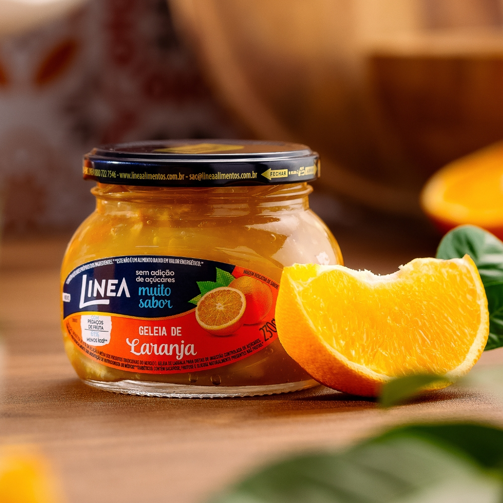 Geleia de Laranja Linea é cremosa, sem adição de açúcar, repleta de sabor e pedaços da fruta. Com o Laranja como 1º ingrediente, essa delícia é 61% menos calórica que geleias com açúcar. Uma explosão de doçura saudável para transformar suas refeições. 1 KIT COMPOSTO POR: - 2 unidades de Geleia Linea Sabor Laranja de 230g (cada). INGREDIENTES: Laranja, Suco De Limão, Edulcorantes: Sorbitol e Sucralose, Estabilizante Pectina. Conservador Sorbato de Potássio e Agente de Firmeza Fosfato Tricálcico. NÃO CONTÉM GLÚTEN.