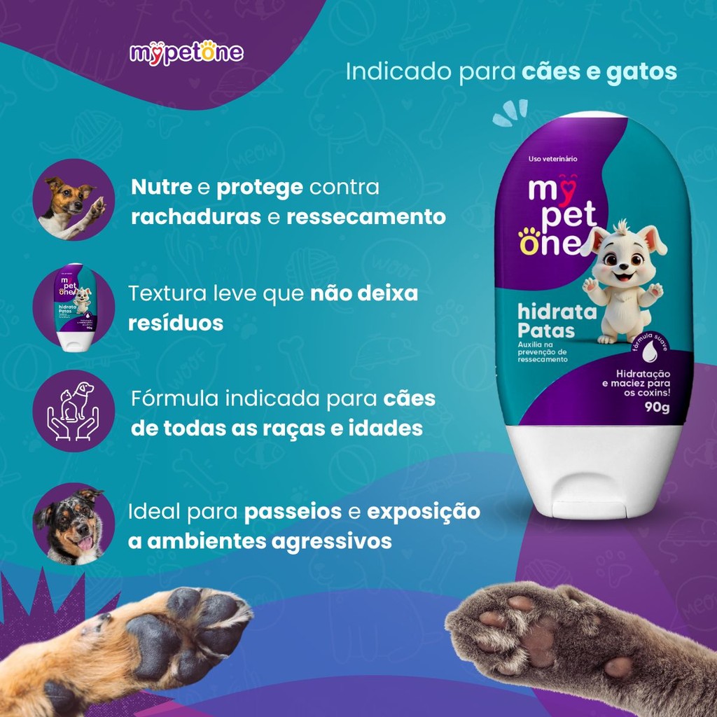 Hidrata Patinhas My Pet One – 90g Proteção, hidratação e cuidado para as patinhas do seu pet. O Hidrata Patinhas My Pet One foi desenvolvido especialmente para manter as almofadas das patas sempre macias, saudáveis e protegidas contra rachaduras, ressecamento e agressões externas como calor, frio ou pisos ásperos. Com textura leve e rápida absorção, sua fórmula segura é indicada para cães de todas as raças e idades. Ideal para uso diário ou sempre que o pet for exposto a longas caminhadas, passeios ou ambientes agressivos. Benefícios: - Hidrata e nutre profundamente as patinhas. - Previne rachaduras, ressecamento e desconfortos. - Textura suave com rápida absorção. - Fórmula segura para uso frequente. - Indicado para cães de todas as raças e idades. Modo de Uso: Com as patinhas limpas e secas, aplique uma pequena quantidade do produto e massageie suavemente até completa absorção. Pode ser utilizado diariamente ou antes/apos passeios. Evite que o animal lamba as patas até a absorção completa. Especificações Técnicas: - Apresentação: Creme hidratante - Peso: 90g - Indicação: Cães de todas as raças e idades - Uso: Externo, para aplicação nas almofadas das patas - Idade: A partir de 90 dias My Pet One – Cuidar é demonstrar amor todos os dias.